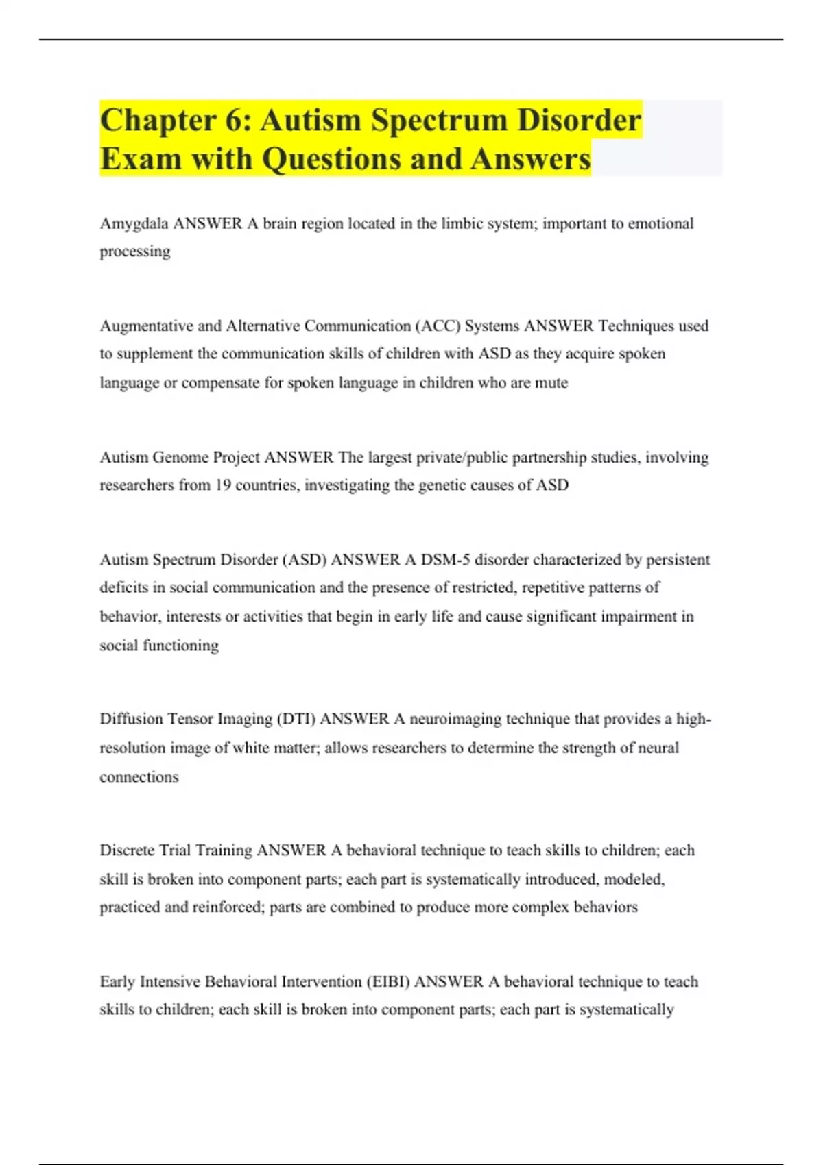 Chapter 6: Autism Spectrum Disorder Exam with Questions and Answers Amygdala ANSWER A brain region located in the limbic system; important to emotional processing Augmentative and Alternative Communication (ACC) Systems ANSWER Techniques used to supplement the communication skills of children with ASD as they acquire spoken language or compensate for spoken language in children who are mute Autism Genome Project ANSWER The largest private/public partnership studies, involving researchers from 19 countries, investigating the genetic causes of ASD Autism Spectrum Disorder (ASD) ANSWER A DSM-5 disorder characterized by persistent deficits in social communication and the presence of restricted, repetitive patterns of behavior, interests or activities that begin in early life and cause significant impairment in social functioning Diffusion Tensor Imaging (DTI) ANSWER A neuroimaging technique that provides a high-resolution image of white matter; allows researchers to determine the strength of neural connections Discrete Trial Training ANSWER A behavioral technique to teach skills to children; each skill is broken into component parts; each part is systematically introduced, modeled, practiced and reinforced; parts are combined to produce more complex behaviors Early Intensive Behavioral Intervention (EIBI) ANSWER A behavioral technique to teach skills to children; each skill is broken into component parts; each part is systematically