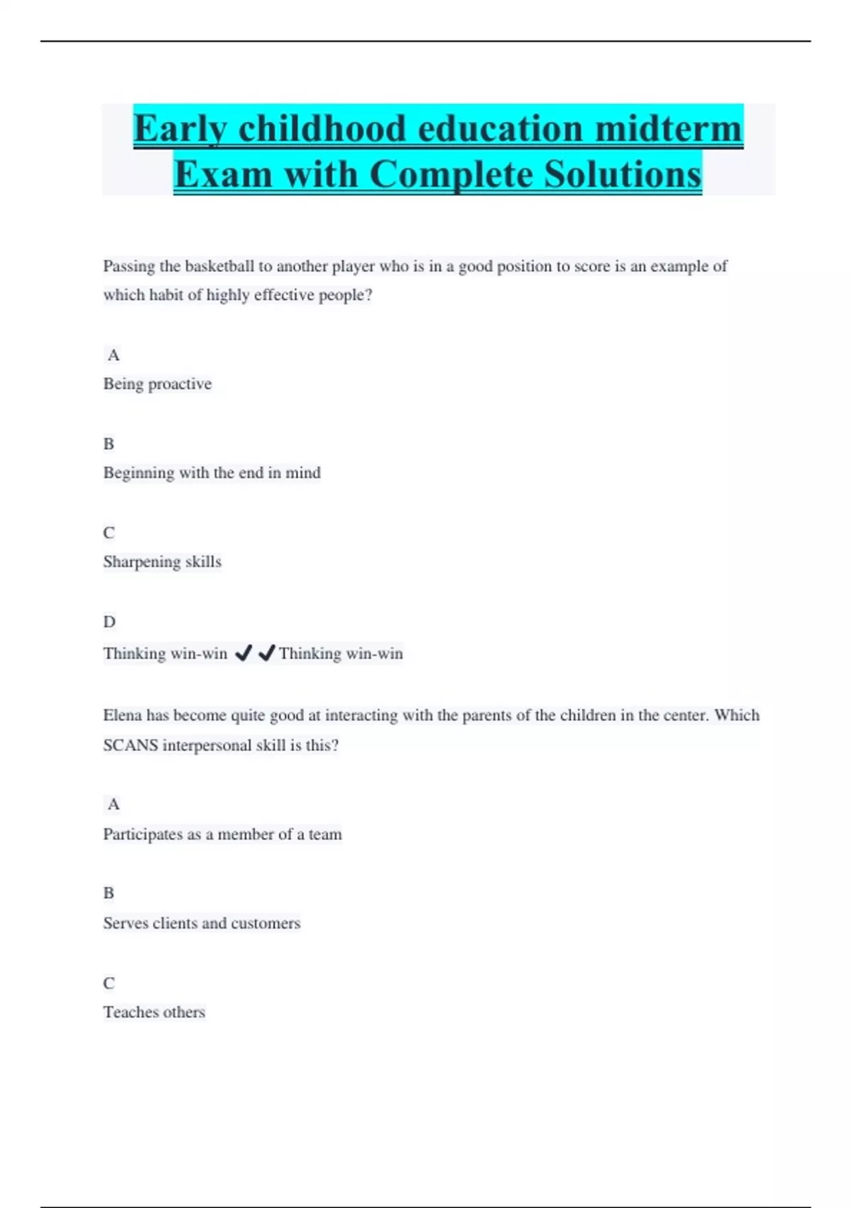 Early childhood education midterm Exam with Complete Solutions Passing the basketball to another player who is in a good position to score is an example of which habit of highly effective people? A Being proactive B Beginning with the end in mind C Sharpening skills D Thinking win-win ️️Thinking win-win Elena has become quite good at interacting with the parents of the children in the center. Which SCANS interpersonal skill is this? A Participates as a member of a team B Serves clients and customers C Teaches others