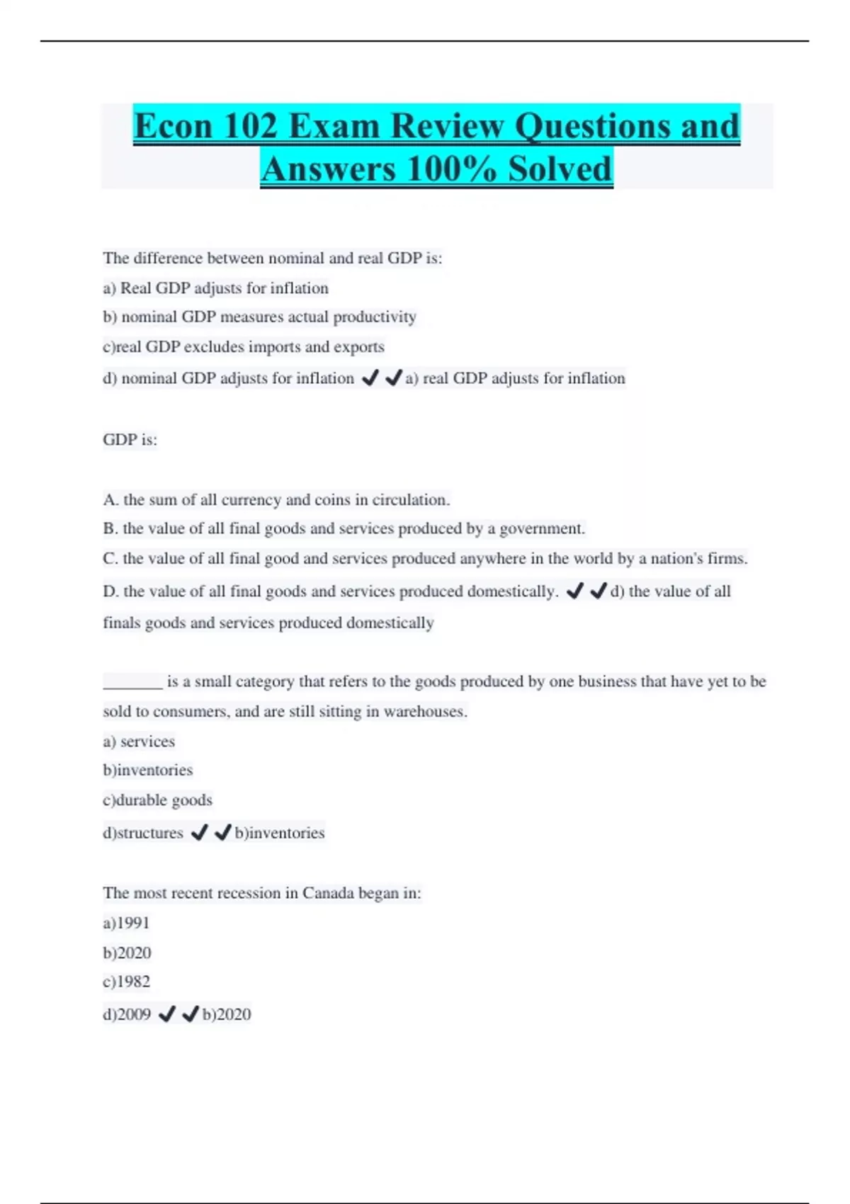 Econ 102 Exam Review Questions and Answers 100% Solved The difference between nominal and real GDP is: a) Real GDP adjusts for inflation b) nominal GDP measures actual productivity c)real GDP excludes imports and exports d) nominal GDP adjusts for inflation ️️a) real GDP adjusts for inflation GDP is: A. the sum of all currency and coins in circulation. B. the value of all final goods and services produced by a government. C. the value of all final good and services produced anywhere in the world by a nation's firms. D. the value of all final goods and services produced domestically. ️️d) the value of all finals goods and services produced domestically
