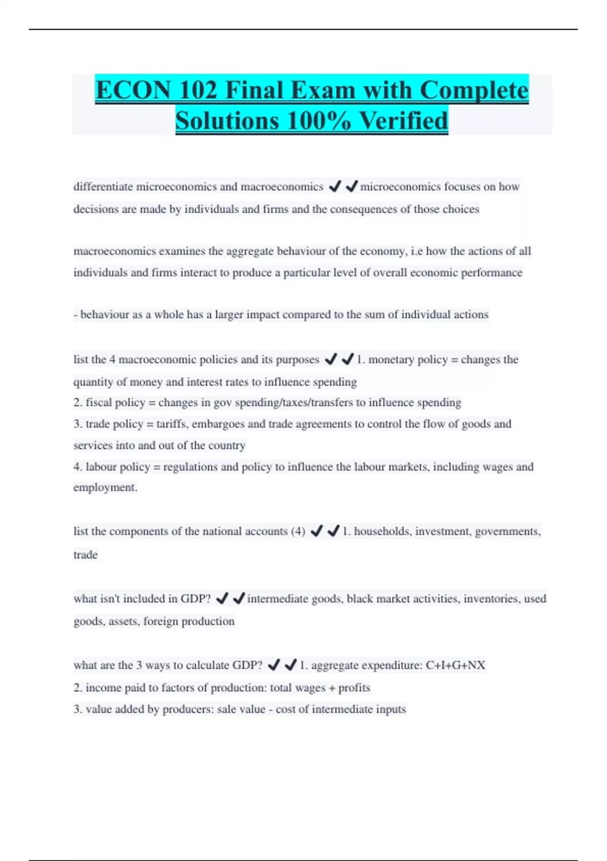 ECON 102 Final Exam with Complete Solutions 100% Verified differentiate microeconomics and macroeconomics ️️microeconomics focuses on how decisions are made by individuals and firms and the consequences of those choices macroeconomics examines the aggregate behaviour of the economy, i.e how the actions of all individuals and firms interact to produce a particular level of overall economic performance - behaviour as a whole has a larger impact compared to the sum of individual actions list the 4 macroeconomic policies and its purposes ️️1. monetary policy = changes the quantity of money and interest rates to influence spending 2. fiscal policy = changes in gov spending/taxes/transfers to influence spending 3. trade policy = tariffs, embargoes and trade agreements to control the flow of goods and services into and out of the country 4. labour policy = regulations and policy to influence the labour markets, including wages and