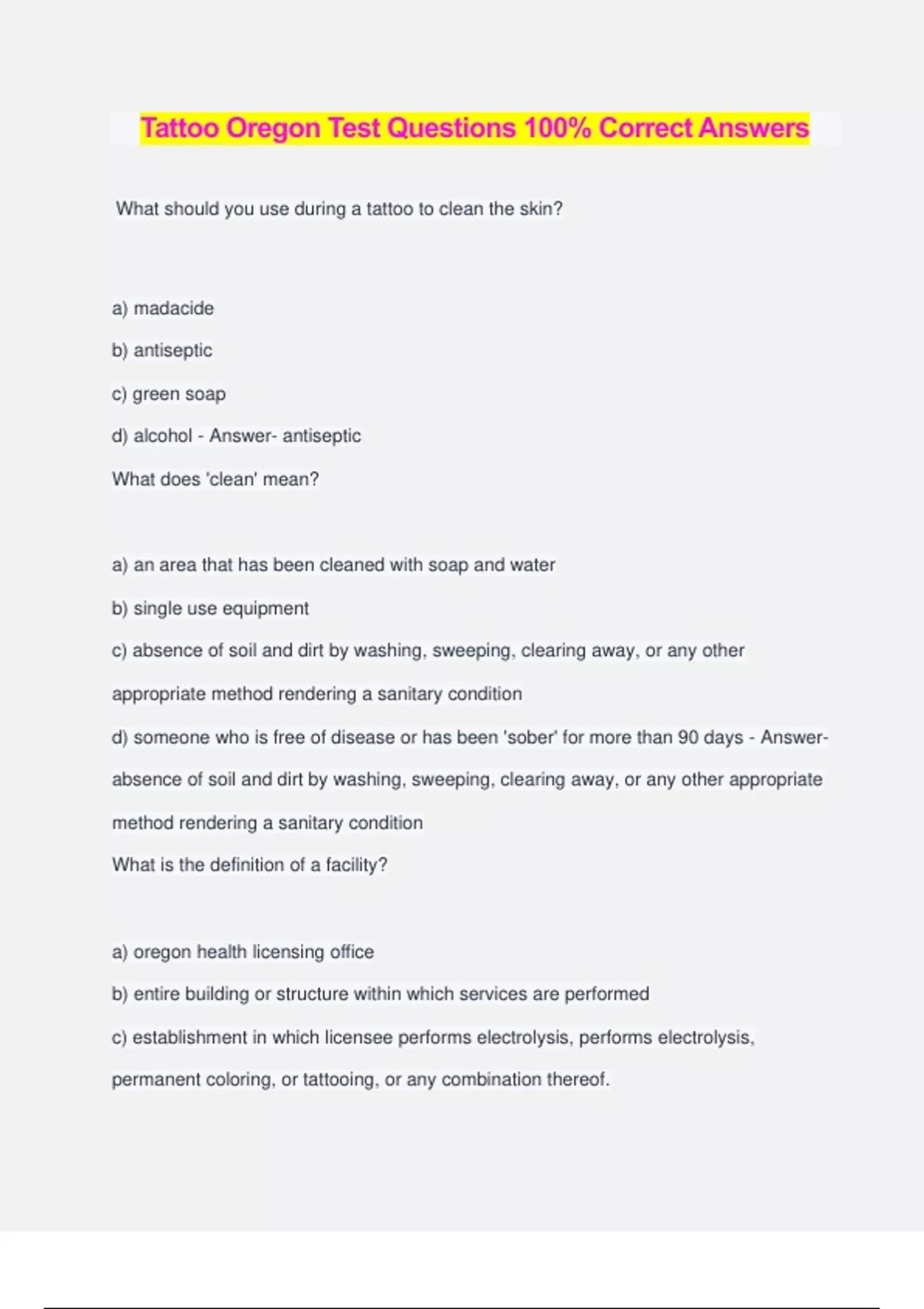 Tattoo Oregon Test Questions 100% Correct Answers What should you use during a tattoo to clean the skin? a) madacide b) antiseptic c) green soap d) alcohol - Answer- antiseptic What does 'clean' mean? a) an area that has been cleaned with soap and water b) single use equipment c) absence of soil and dirt by washing, sweeping, clearing away, or any other appropriate method rendering a sanitary condition d) someone who is free of disease or has been 'sober' for more than 90 days - Answer- absence of soil and dirt by washing, sweeping, clearing away, or any other appropriate method rendering a sanitary condition What is the definition of a facility? a) oregon health licensing office b) entire building or structure within which services are performed c) establishment in which licensee performs electrolysis, performs electrolysis, permanent coloring, or tattooing, or any combination thereof. d) establishment where a licensed tattoo artist posts their license, has a station to work from and is considered place of employment - Answer- establishment in which licensee performs electrolysis, performs electrolysis, permanent coloring, or tattooing, or any combination thereof. What do you call the destruction of all forms macrobiotic life, including spores? a) sterilization b) sanitize c) clean d) fungicide - Answer- sterilization a spray bottle is an acceptable tool to use to apply liquid to the skin? true/false - Answer- true What is tinea corporis commonly known as? a) dandruff b) athletes foot c) ringworm d) jock itch - Answer- Ringworm bar soap is prohibited when washing hands before, during and after a procedure? true/false - Answer- true What sinks do not qualify as a water source for the facility premises? a) employee hand washing sinks b) bathroom sinks c) sinks with less than 30 lbs of pressure d) sinks with more than 30 lbs of pressure - Answer- b) bathroom sinks What is the most important procedure for prevention of all infections, including HIV? a) accurate aftercare and pre-service sheet b) waivers c) single-use tubes and needles d) good hand-washing after glove removal and between each client - Answer- good hand-washing after glove removal and between each client What should I do if I notice a tear in my gloves? a) Take gloves off, put new gloves on. b) Take gloves off, use an approved hand sanitizer, put new gloves on c) Take gloves off, wash hands, put new gloves on d) Nothing as long as I did not break skin - Answer- c) Take gloves off, wash hands, put new gloves on Whom of the following may you tattoo? Someone who.... . . a) Is pregnant b) Is visibly intoxicated c) A minor with parental consent d) Shows signs of intravenous drug use - Answer- a) Is pregnant What should aftercare instructions consist of? a) Approved Doctor List, Touch-up fees, Referral Information b) Approved lotions, risks, artist contact information c) Verbal and written instructions regarding care following service, possible side effects and restrictions d) Possible reactions, side effects, and potential complications of the tattooing process. - Answer- c) Verbal and written instructions regarding care following service, possible side effects and restrictions What are the approved sterilization modes for instruments used in the practice of permanent color or tattoo artist services? a) Madacide or alcohol b) Ultrasonic or Alcohol c) Autoclave or Dry Heat Unit d) Single-use or ultrasonic . - Answer- c) Autoclave or Dry Heat Unit Which of the following is a high level disinfectant