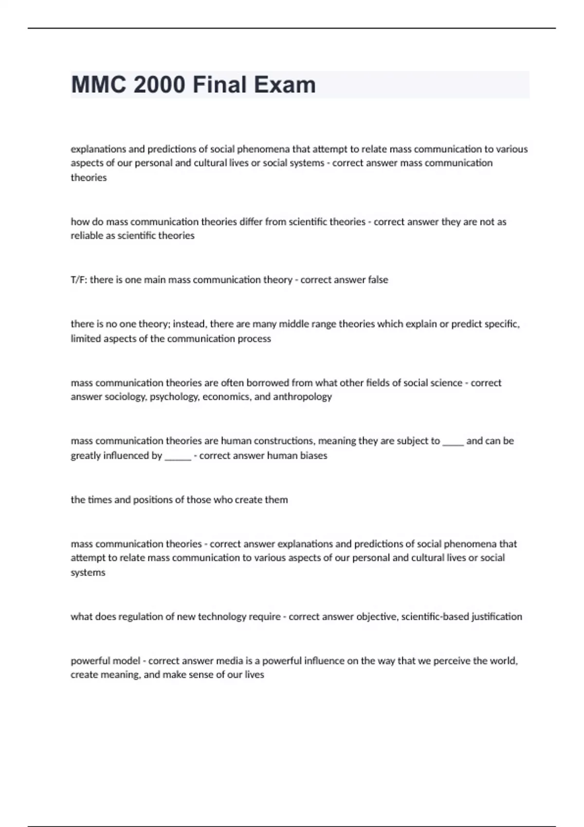 Mmc 2000 Florida State University -MMC 2000 Final Exam correctly answered explanations and predictions of social phenomena that attempt to relate mass communication to various aspects of our personal and cultural lives or social systems - correct answer mass communication theories how do mass communication theories differ from scientific theories - correct answer they are not as reliable as scientific theories T/F: there is one main mass communication theory - correct answer false there is no one theory; instead, there are many middle range theories which explain or predict specific, limited aspects of the communication process mass communication theories are often borrowed from what other fields of social science - correct answer sociology, psychology, economics, and anthropology mass communication theories are human constructions, meaning they are subject to ____ and can be greatly influenced by _____ - correct answer human biases the times and positions of those who create them mass communication theories - correct answer explanations and predictions of social phenomena that attempt to relate mass communication to various aspects of our personal and cultural lives or social systems what does regulation of new technology require - correct answer objective, scientific-based justification powerful model - correct answer media is a powerful influence on the way that we perceive the world, create meaning, and make sense of our lives