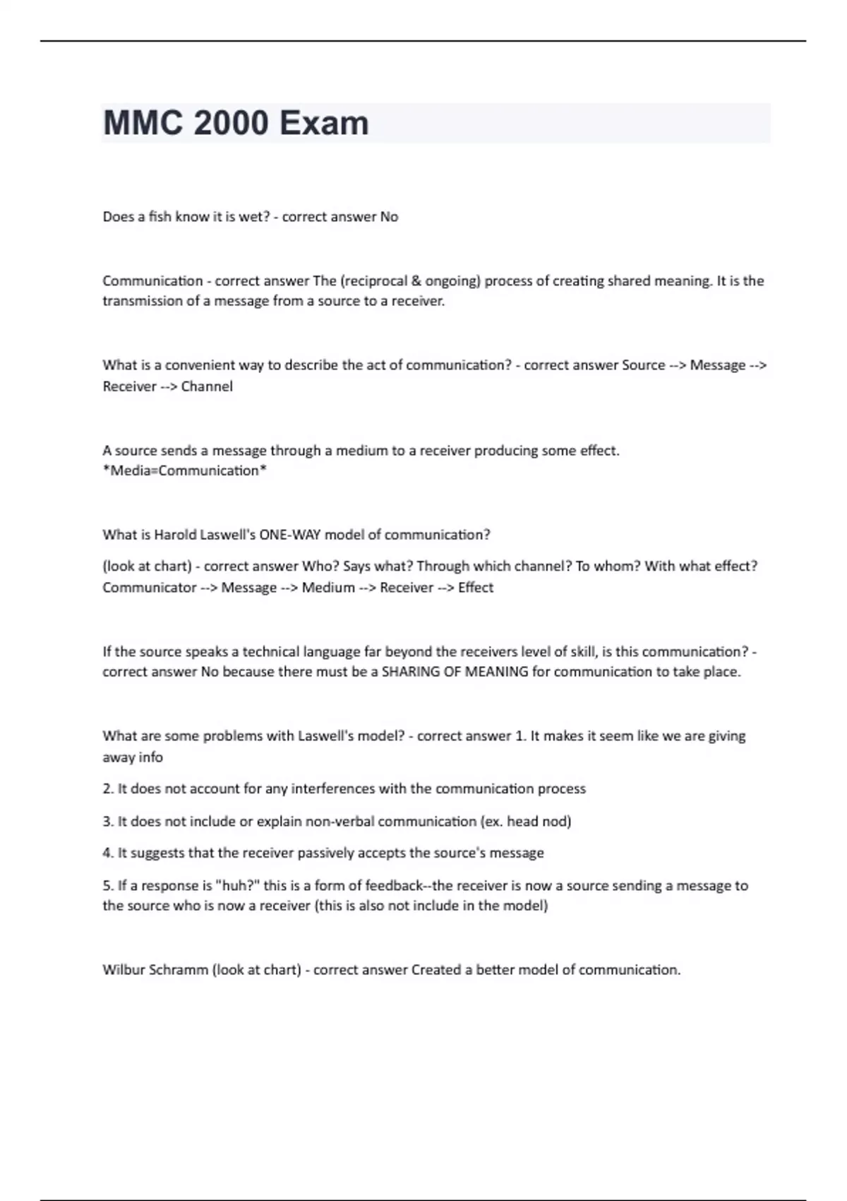 Mmc 2000 Florida State University -MMC 2000 Exam with answersDoes a fish know it is wet? - correct answer No Communication - correct answer The (reciprocal & ongoing) process of creating shared meaning. It is the transmission of a message from a source to a receiver. What is a convenient way to describe the act of communication? - correct answer Source --> Message --> Receiver --> Channel A source sends a message through a medium to a receiver producing some effect. *Media=Communication* What is Harold Laswell's ONE-WAY model of communication? (look at chart) - correct answer Who? Says what? Through which channel? To whom? With what effect? Communicator --> Message --> Medium --> Receiver --> Effect If the source speaks a technical language far beyond the receivers level of skill, is this communication? - correct answer No because there must be a SHARING OF MEANING for communication to take place. What are some problems with Laswell's model? - correct answer 1. It makes it seem like we are giving away info 2. It does not account for any interferences with the communication process 3. It does not include or explain non-verbal communication (ex. head nod) 4. It suggests that the receiver passively accepts the source's message 5. If a response is "huh?" this is a form of feedback--the receiver is now a source sending a message to the source who is now a receiver (this is also not include in the model) Wilbur Schramm (look at chart) - correct answer Created a better model of communication.