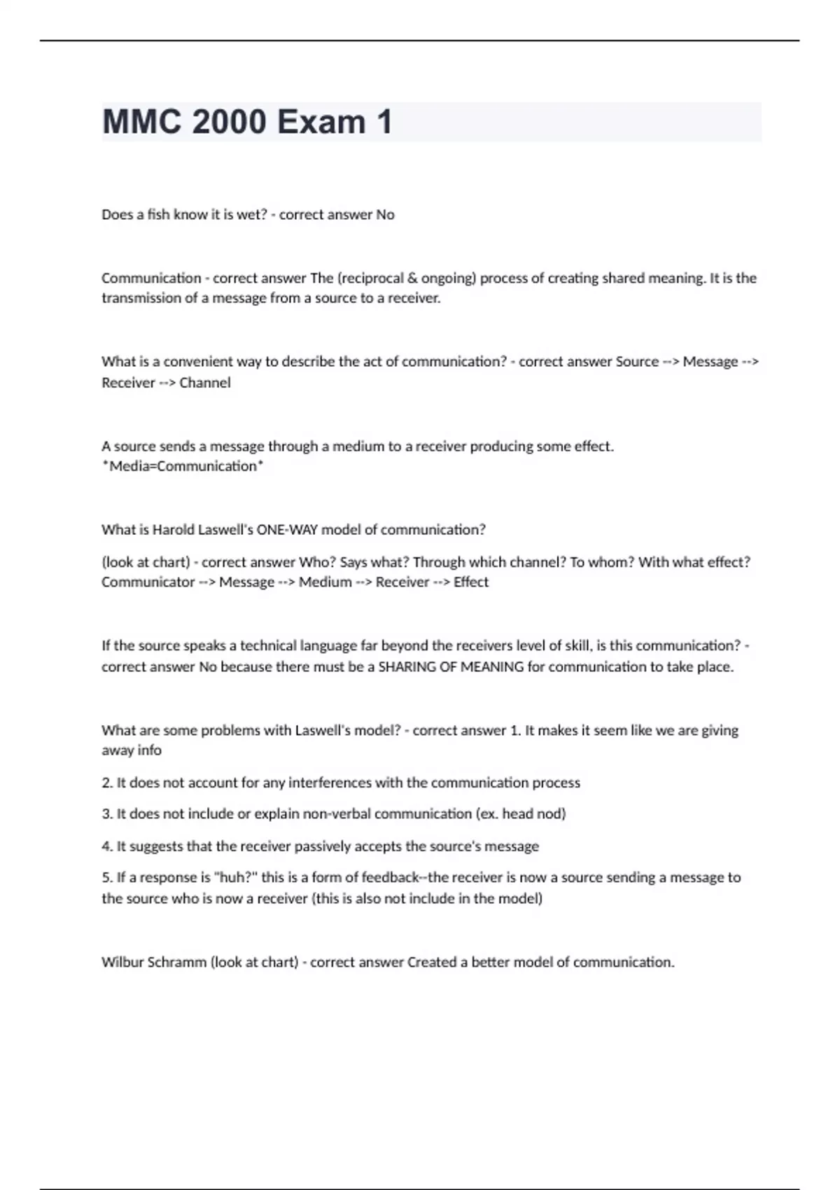 Mmc 2000 Florida State University -MMC 2000 Exam 1 questions with complete solutionsDoes a fish know it is wet? - correct answer No Communication - correct answer The (reciprocal & ongoing) process of creating shared meaning. It is the transmission of a message from a source to a receiver. What is a convenient way to describe the act of communication? - correct answer Source --> Message --> Receiver --> Channel A source sends a message through a medium to a receiver producing some effect. *Media=Communication* What is Harold Laswell's ONE-WAY model of communication? (look at chart) - correct answer Who? Says what? Through which channel? To whom? With what effect? Communicator --> Message --> Medium --> Receiver --> Effect If the source speaks a technical language far beyond the receivers level of skill, is this communication? - correct answer No because there must be a SHARING OF MEANING for communication to take place. What are some problems with Laswell's model? - correct answer 1. It makes it seem like we are giving away info 2. It does not account for any interferences with the communication process 3. It does not include or explain non-verbal communication (ex. head nod) 4. It suggests that the receiver passively accepts the source's message 5. If a response is "huh?" this is a form of feedback--the receiver is now a source sending a message to the source who is now a receiver (this is also not include in the model) Wilbur Schramm (look at chart) - correct answer Created a better model of communication. Encoder/Interpreter/Decoder-->Message--> Encoder/Interpreter/Decoder-->Message--> Interpersonal Communication - correct answer Communication between two or a few people Encode - correct answer A message is first encoded: transforming ideas into an understandable sign or symbol Example: speaking, writing, filming, printing Decode - correct answer Once received, the message is decoded: interpreting signs or symbols Example: listening, reading, watching Noise - correct answer Anything that interferes with successful communication Example: screaming or a missing page from a book Medium - correct answer Encoded messages are carried by a medium. A medium is a vehicle by which messages are conveyed Example: a phone carries our voice to a friends across town Mass Medium - correct answer When the medium is a technology that carries messages to a large number of people. We use media and mass media interchangeably. Example: radio carries the sound of music and news What mass media do we regularly use? - correct answer Radio, TV, books, magazines, newspapers, movies, sound recordings, cell phones and computer networks Mass Communication - correct answer The process of creating shared meaning between the mass media and their audiences Schramm uses Osgood's ideas - correct answer Schramm recreated a general model to help visualize the aspects of the mass communication process Schramm's model of mass communication (look at chart) - correct answer (From personal to mass)