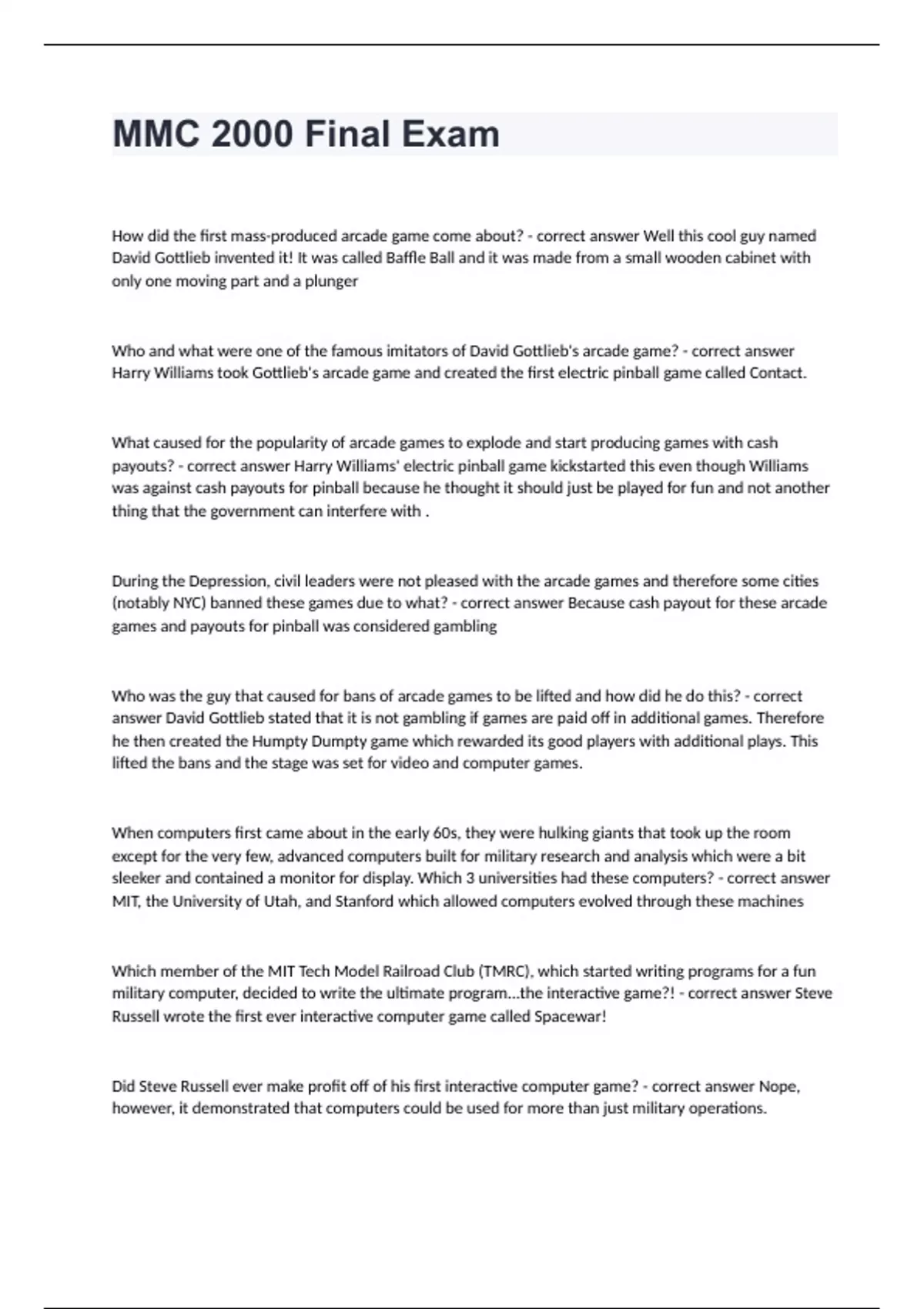 Mmc 2000 Florida State University -MMC 2000 Final Exam with verified solutionsHow did the first mass-produced arcade game come about? - correct answer Well this cool guy named David Gottlieb invented it! It was called Baffle Ball and it was made from a small wooden cabinet with only one moving part and a plunger Who and what were one of the famous imitators of David Gottlieb's arcade game? - correct answer Harry Williams took Gottlieb's arcade game and created the first electric pinball game called Contact. What caused for the popularity of arcade games to explode and start producing games with cash payouts? - correct answer Harry Williams' electric pinball game kickstarted this even though Williams was against cash payouts for pinball because he thought it should just be played for fun and not another thing that the government can interfere with . During the Depression, civil leaders were not pleased with the arcade games and therefore some cities (notably NYC) banned these games due to what? - correct answer Because cash payout for these arcade games and payouts for pinball was considered gambling Who was the guy that caused for bans of arcade games to be lifted and how did he do this? - correct answer David Gottlieb stated that it is not gambling if games are paid off in additional games. Therefore he then created the Humpty Dumpty game which rewarded its good players with additional plays. This lifted the bans and the stage was set for video and computer games. When computers first came about in the early 60s, they were hulking giants that took up the room except for the very few, advanced computers built for military research and analysis which were a bit sleeker and contained a monitor for display. Which 3 universities had these computers? - correct answer MIT, the University of Utah, and Stanford which allowed computers evolved through these machines Which member of the MIT Tech Model Railroad Club (TMRC), which started writing programs for a fun military computer, decided to write the ultimate program...the interactive game?! - correct answer Steve Russell wrote the first ever interactive computer game called Spacewar! Did Steve Russell ever make profit off of his first interactive computer game? - correct answer Nope, however, it demonstrated that computers could be used for more than just military operations.