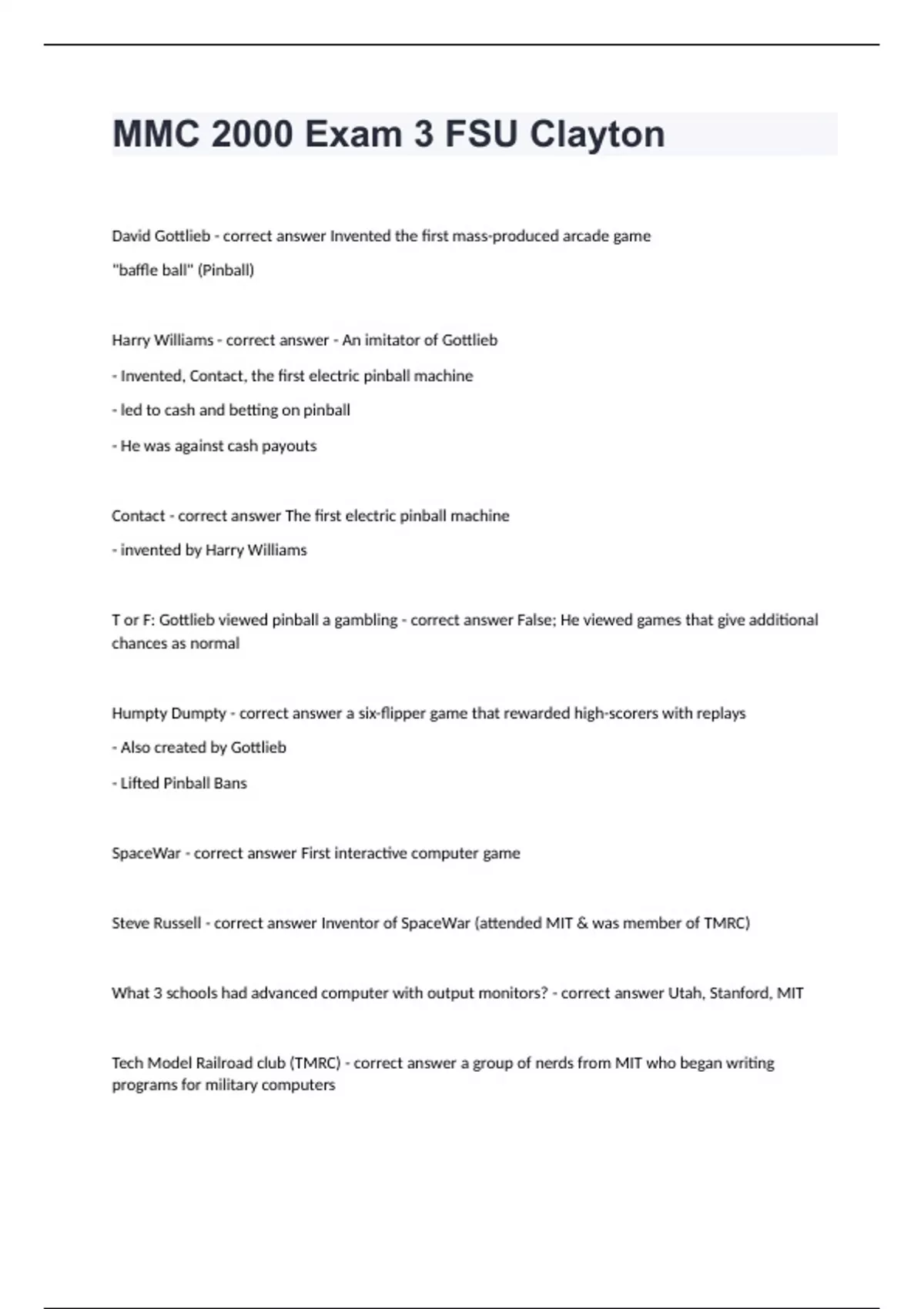 David Gottlieb - correct answer Invented the first mass-produced arcade game "baffle ball" (Pinball) Harry Williams - correct answer - An imitator of Gottlieb - Invented, Contact, the first electric pinball machine - led to cash and betting on pinball - He was against cash payouts Contact - correct answer The first electric pinball machine - invented by Harry Williams T or F: Gottlieb viewed pinball a gambling - correct answer False; He viewed games that give additional chances as normal Humpty Dumpty - correct answer a six-flipper game that rewarded high-scorers with replays - Also created by Gottlieb - Lifted Pinball Bans SpaceWar - correct answer First interactive computer game Steve Russell - correct answer Inventor of SpaceWar (attended MIT & was member of TMRC) What 3 schools had advanced computer with output monitors? - correct answer Utah, Stanford, MIT Tech Model Railroad club (TMRC) - correct answer a group of nerds from MIT who began writing programs for military computers