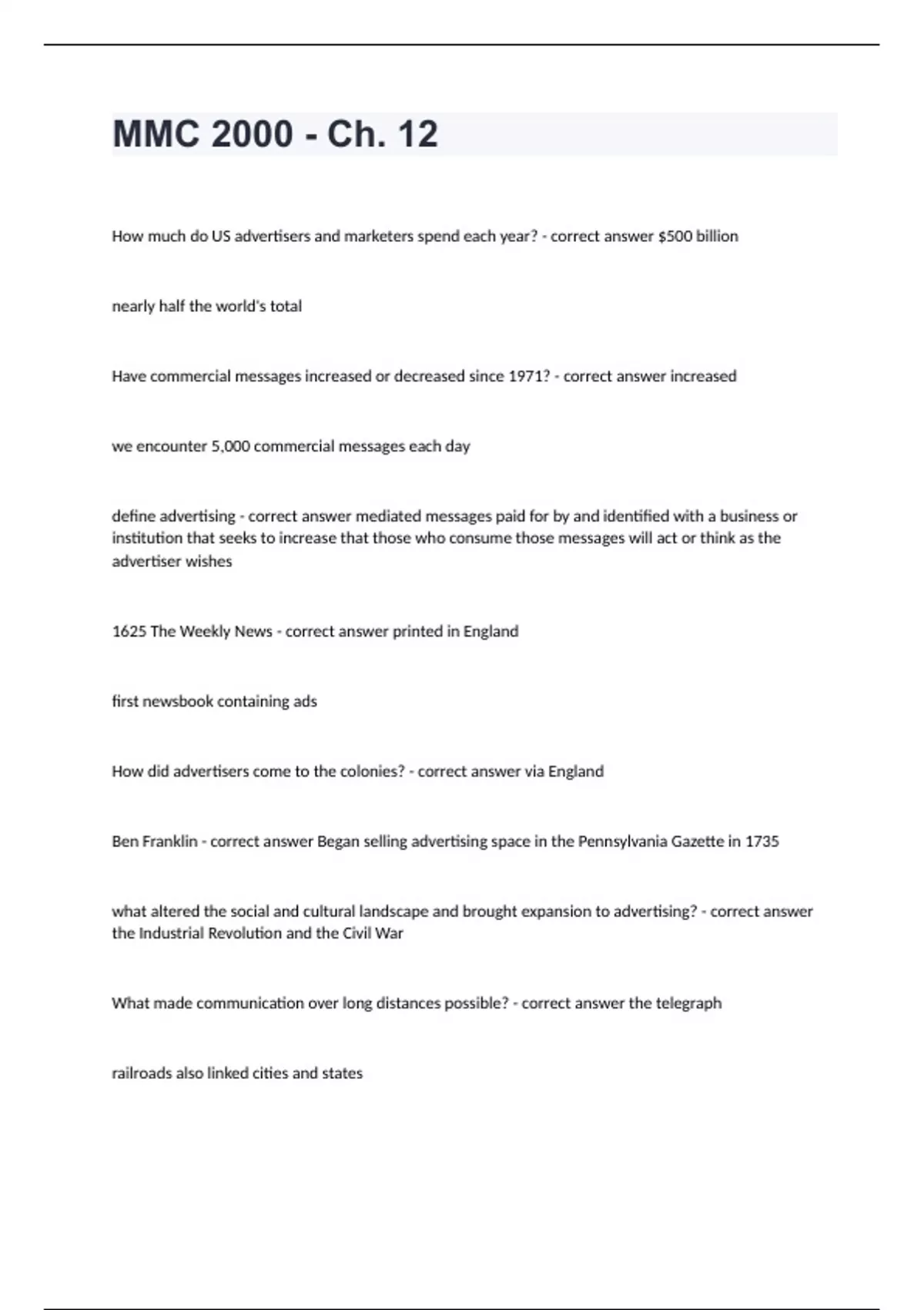 Mmc 2000 Florida State University -MMC 2000 - Ch. 12 fully solvedHow much do US advertisers and marketers spend each year? - correct answer $500 billion nearly half the world's total Have commercial messages increased or decreased since 1971? - correct answer increased we encounter 5,000 commercial messages each day define advertising - correct answer mediated messages paid for by and identified with a business or institution that seeks to increase that those who consume those messages will act or think as the advertiser wishes 1625 The Weekly News - correct answer printed in England first newsbook containing ads How did advertisers come to the colonies? - correct answer via England Ben Franklin - correct answer Began selling advertising space in the Pennsylvania Gazette in 1735 what altered the social and cultural landscape and brought expansion to advertising? - correct answer the Industrial Revolution and the Civil War What made communication over long distances possible? - correct answer the telegraph railroads also linked cities and states