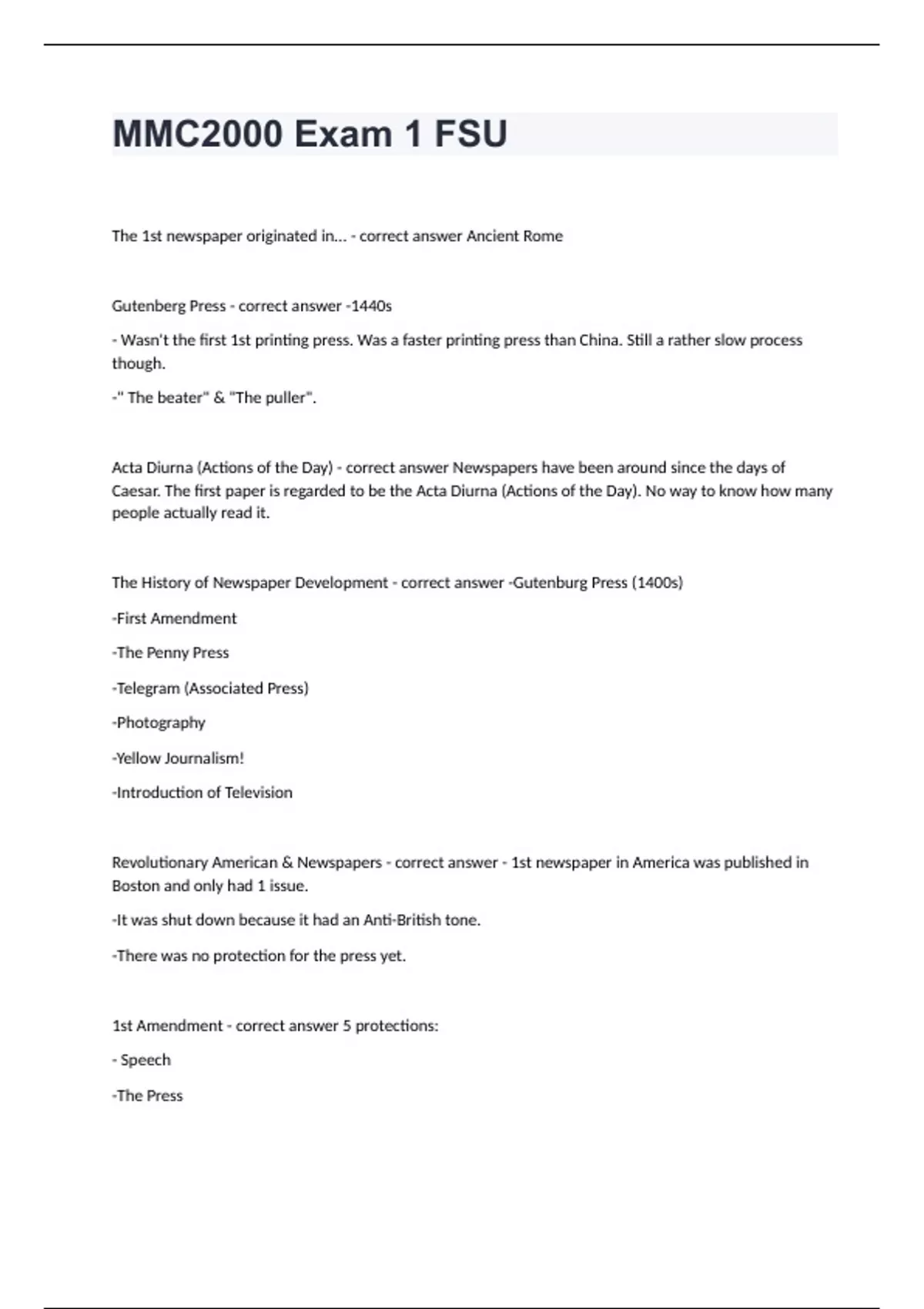 Mmc 2000 Florida State University -MMC2000 Exam 1 FSU well solvedThe 1st newspaper originated in... - correct answer Ancient Rome Gutenberg Press - correct answer -1440s - Wasn't the first 1st printing press. Was a faster printing press than China. Still a rather slow process though. -" The beater" & "The puller". Acta Diurna (Actions of the Day) - correct answer Newspapers have been around since the days of Caesar. The first paper is regarded to be the Acta Diurna (Actions of the Day). No way to know how many people actually read it. The History of Newspaper Development - correct answer -Gutenburg Press (1400s) -First Amendment -The Penny Press -Telegram (Associated Press) -Photography -Yellow Journalism! -Introduction of Television Revolutionary American & Newspapers - correct answer - 1st newspaper in America was published in Boston and only had 1 issue. -It was shut down because it had an Anti-British tone. -There was no protection for the press yet. 1st Amendment - correct answer 5 protections: - Speech -The Press -Assembly