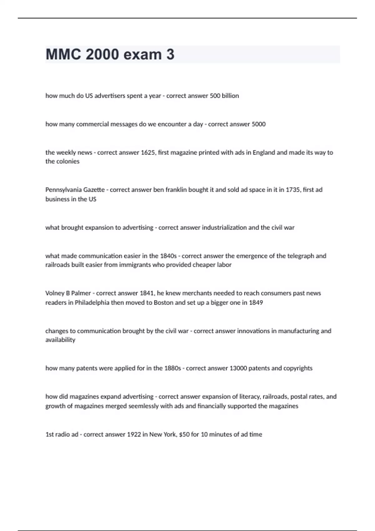 Mmc 2000 Florida State University -MMC 2000 exam 3 with correct answers how much do US advertisers spent a year - correct answer 500 billion how many commercial messages do we encounter a day - correct answer 5000 the weekly news - correct answer 1625, first magazine printed with ads in England and made its way to the colonies Pennsylvania Gazette - correct answer ben franklin bought it and sold ad space in it in 1735, first ad business in the US what brought expansion to advertising - correct answer industrialization and the civil war what made communication easier in the 1840s - correct answer the emergence of the telegraph and railroads built easier from immigrants who provided cheaper labor Volney B Palmer - correct answer 1841, he knew merchants needed to reach consumers past news readers in Philadelphia then moved to Boston and set up a bigger one in 1849 changes to communication brought by the civil war - correct answer innovations in manufacturing and availability how many patents were applied for in the 1880s - correct answer 13000 patents and copyrights how did magazines expand advertising - correct answer expansion of literacy, railroads, postal rates, and growth of magazines merged seemlessly with ads and financially supported the magazines 1st radio ad - correct answer 1922 in New York, $50 for 10 minutes of ad time