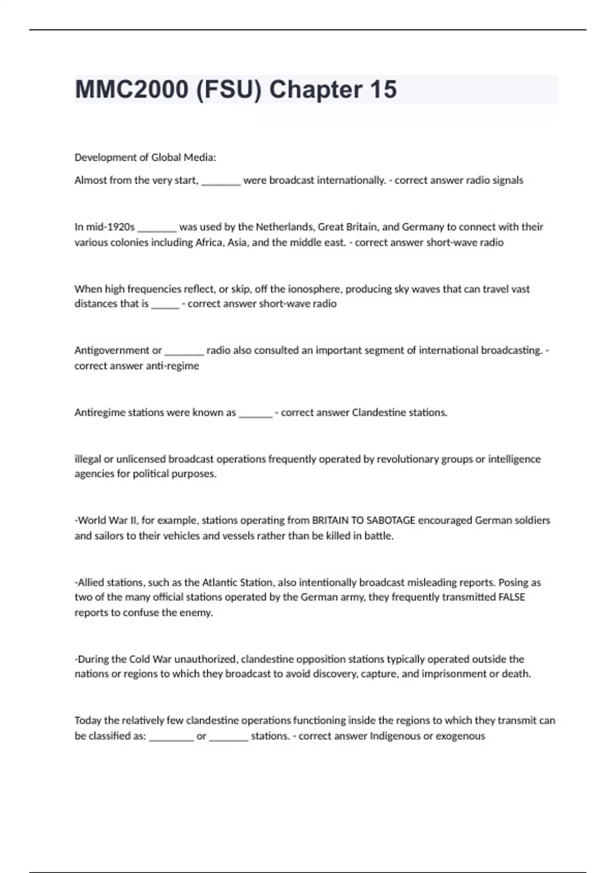 Mmc 2000 Florida State University -MMC2000 (FSU) Chapter 15Development of Global Media: Almost from the very start, _______ were broadcast internationally. - correct answer radio signals In mid-1920s _______ was used by the Netherlands, Great Britain, and Germany to connect with their various colonies including Africa, Asia, and the middle east. - correct answer short-wave radio When high frequencies reflect, or skip, off the ionosphere, producing sky waves that can travel vast distances that is _____ - correct answer short-wave radio Antigovernment or _______ radio also consulted an important segment of international broadcasting. - correct answer anti-regime Antiregime stations were known as ______ - correct answer Clandestine stations. illegal or unlicensed broadcast operations frequently operated by revolutionary groups or intelligence agencies for political purposes. -World War II, for example, stations operating from BRITAIN TO SABOTAGE encouraged German soldiers and sailors to their vehicles and vessels rather than be killed in battle. -Allied stations, such as the Atlantic Station, also intentionally broadcast misleading reports. Posing as two of the many official stations operated by the German army, they frequently transmitted FALSE reports to confuse the enemy. -During the Cold War unauthorized, clandestine opposition stations typically operated outside the nations or regions to which they broadcast to avoid discovery, capture, and imprisonment or death. Today the relatively few clandestine operations functioning inside the regions to which they transmit can be classified as: ________ or _______ stations. - correct answer Indigenous or exogenous