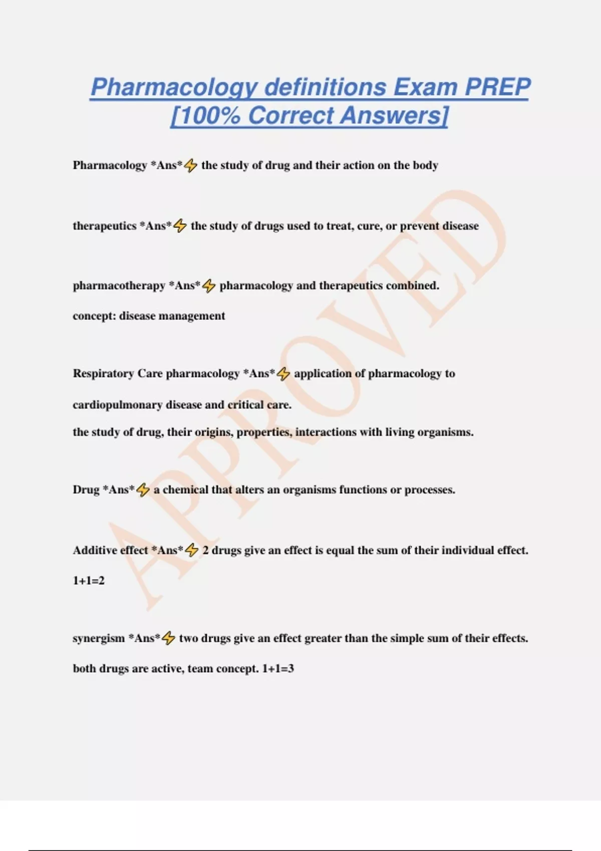 Pharmacology definitions Exam PREP [100% Correct Answers] Pharmacology *Ans* the study of drug and their action on the body therapeutics *Ans* the study of drugs used to treat, cure, or prevent disease pharmacotherapy *Ans* pharmacology and therapeutics combined. concept: disease management Respiratory Care pharmacology *Ans* application of pharmacology to cardiopulmonary disease and critical care. the study of drug, their origins, properties, interactions with living organisms. Drug *Ans* a chemical that alters an organisms functions or processes. Additive effect *Ans* 2 drugs give an effect is equal the sum of their individual effect. 1+1=2 synergism *Ans* two drugs give an effect greater than the simple sum of their effects. both drugs are active, team concept.