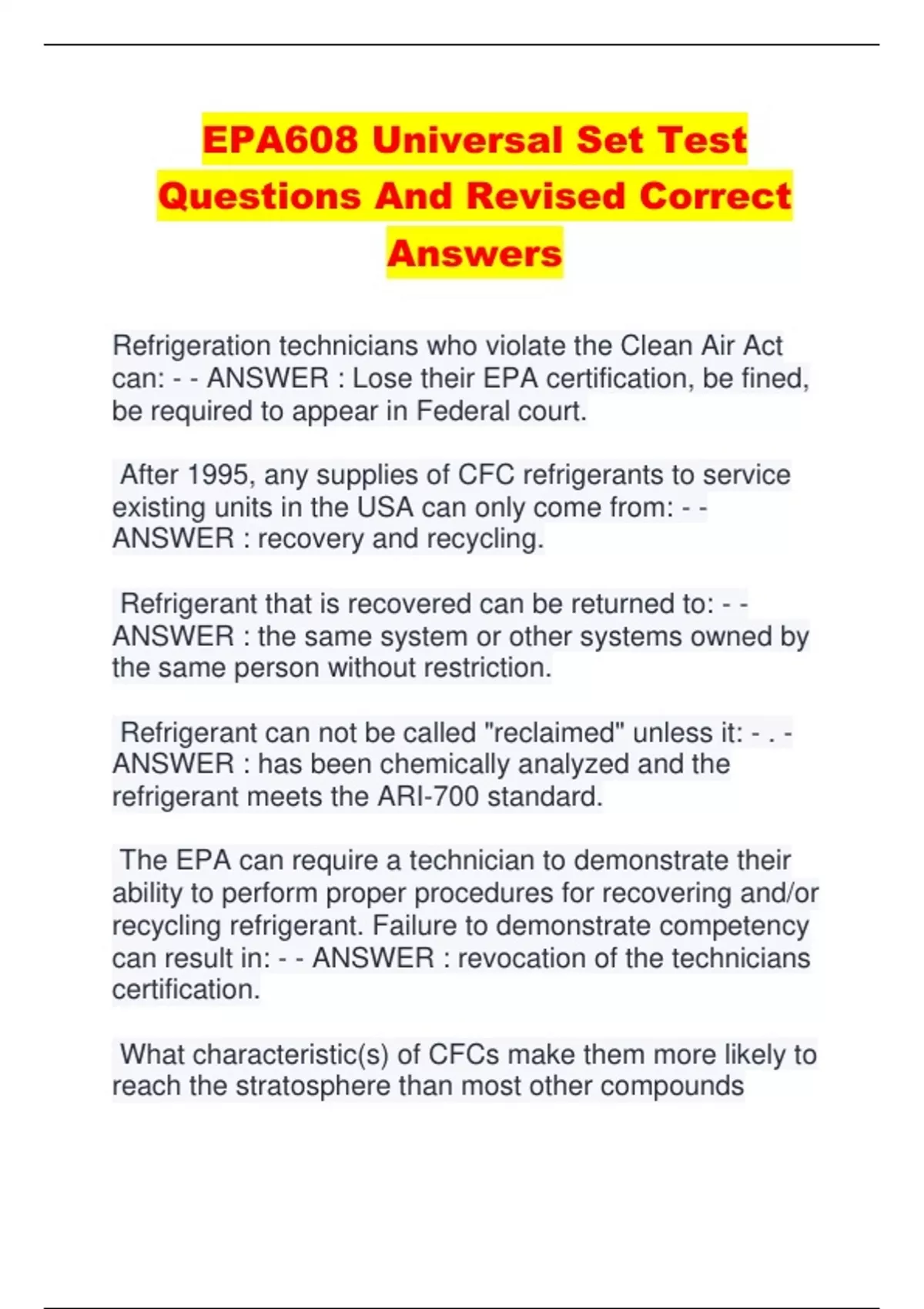 EPA608 Universal Set Test Questions And Revised Correct Answers Refrigeration technicians who violate the Clean Air Act can: - - ANSWER : Lose their EPA certification, be fined, be required to appear in Federal court. After 1995, any supplies of CFC refrigerants to service existing units in the USA can only come from: - - ANSWER : recovery and recycling. Refrigerant that is recovered can be returned to: - - ANSWER : the same system or other systems owned by the same person without restriction. Refrigerant can not be called "reclaimed" unless it: - . - ANSWER : has been chemically analyzed and the refrigerant meets the ARI-700 standard. The EPA can require a technician to demonstrate their ability to perform proper procedures for recovering and/or recycling refrigerant. Failure to demonstrate competency can result in: - - ANSWER : revocation of the technicians certification. What characteristic(s) of CFCs make them more likely to reach the stratosphere than most other compounds containing chlorine? - - ANSWER : Refrigerants that contain chlorine but not hydrogen are so stable that they do not break down in the lower atmosphere after being released. The chlorine or bromine reacts with the ozone, causing it to change back to oxygen, thus destroying the ozone layer.