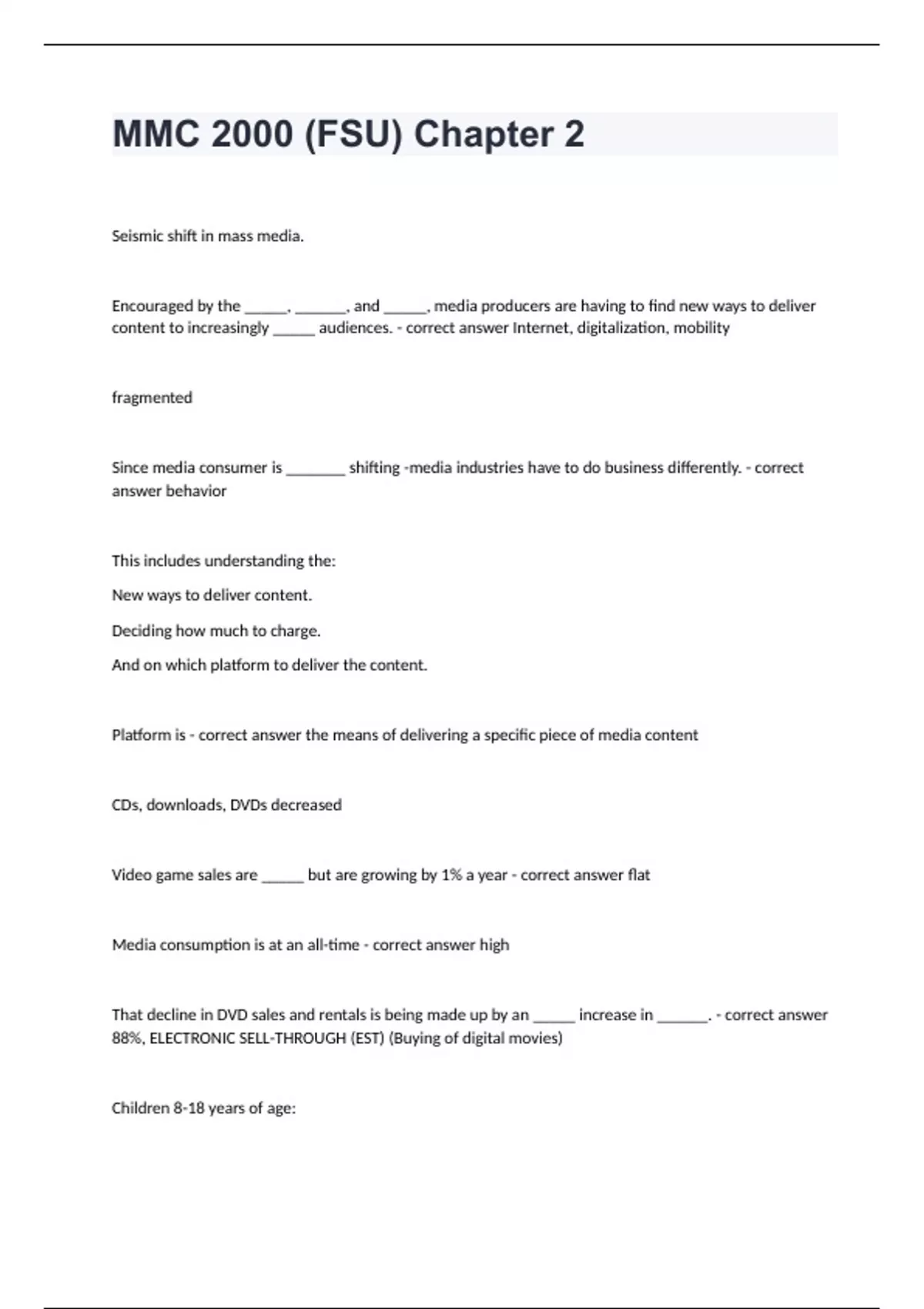 MMC 2000 (FSU) Chapter 2Seismic shift in mass media. Encouraged by the _____, ______, and _____, media producers are having to find new ways to deliver content to increasingly _____ audiences. - correct answer Internet, digitalization, mobility fragmented Since media consumer is _______ shifting -media industries have to do business differently. - correct answer behavior This includes understanding the: New ways to deliver content. Deciding how much to charge. And on which platform to deliver the content. Platform is - correct answer the means of delivering a specific piece of media content CDs, downloads, DVDs decreased Video game sales are _____ but are growing by 1% a year - correct answer flat Media consumption is at an all-time - correct answer high That decline in DVD sales and rentals is being made up by an _____ increase in ______. - correct answer 88%, ELECTRONIC SELL-THROUGH (EST) (Buying of digital movies) Children 8-18 years of age: Spend more than 7 hours a day with media content.