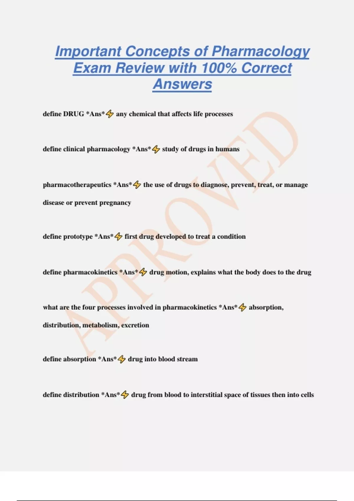 Important Concepts of Pharmacology Exam Review with 100% Correct Answers define DRUG *Ans* any chemical that affects life processes define clinical pharmacology *Ans* study of drugs in humans pharmacotherapeutics *Ans* the use of drugs to diagnose, prevent, treat, or manage disease or prevent pregnancy define prototype *Ans* first drug developed to treat a condition define pharmacokinetics *Ans* drug motion, explains what the body does to the drug what are the four processes involved in pharmacokinetics *Ans* absorption, distribution, metabolism, excretion define absorption *Ans* drug into blood stream define distribution *Ans* drug from blood to interstitial space of tissues then into cells define metabolism *Ans* biotransformation of drug structures define excretion *Ans* mvmt of drug out of the body how do drugs produce their effects *Ans* b
