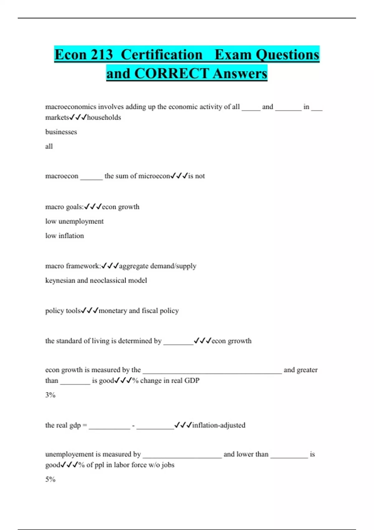 Econ 213 Certification Exam Questions and CORRECT Answers