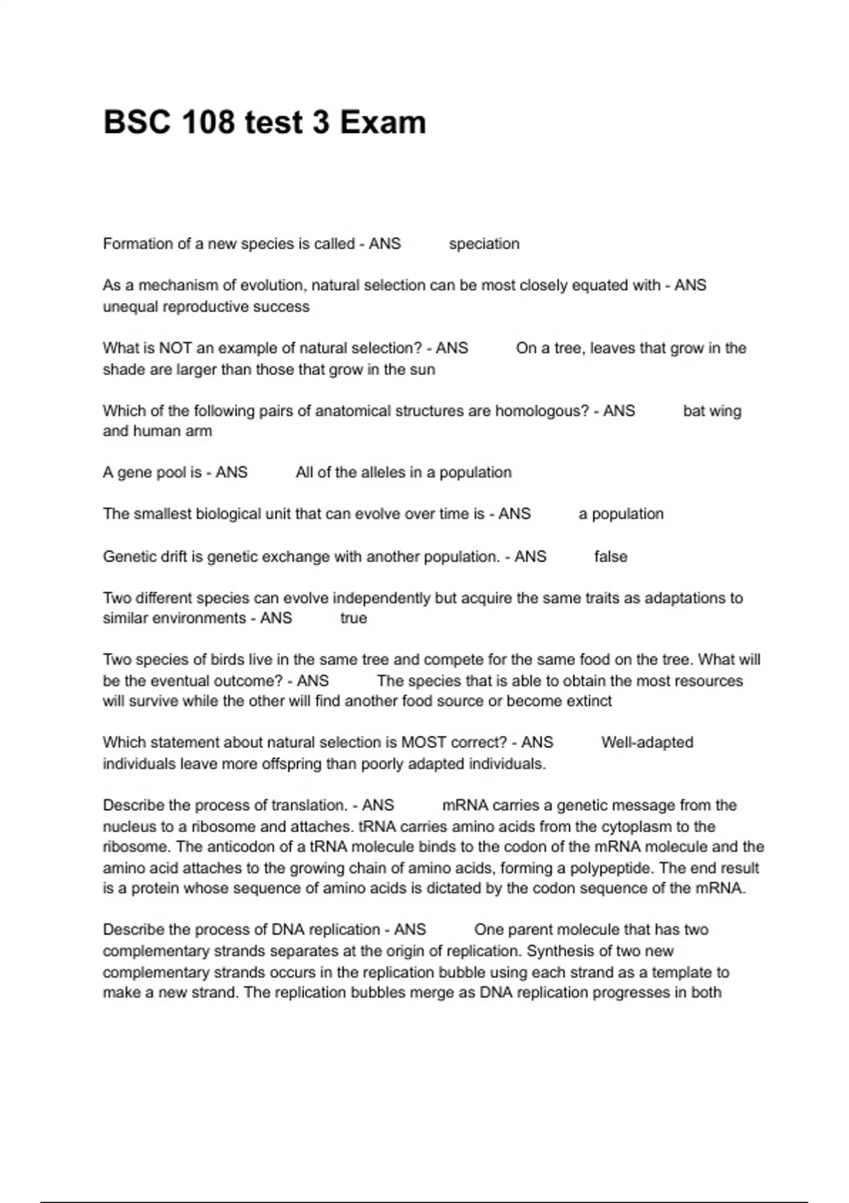 Formation of a new species is called - ANS speciation As a mechanism of evolution, natural selection can be most closely equated with - ANS unequal reproductive success What is NOT an example of natural selection? - ANS On a tree, leaves that grow in the shade are larger than those that grow in the sun Which of the following pairs of anatomical structures are homologous? - ANS bat wing and human arm A gene pool is - ANS All of the alleles in a population The smallest biological unit that can evolve over time is - ANS a population Genetic drift is genetic exchange with another population. - ANS false Two different species can evolve independently but acquire the same traits as adaptations to similar environments - ANS true Two species of birds live in the same tree and compete for the same food on the tree. What will be the eventual outcome? - ANS The species that is able to obtain the most resources will survive while the other will find another food source or become extinct Which statement about natural selection is MOST correct? - ANS Well-adapted individuals leave more offspring than poorly adapted individuals. Describe the process of translation. - ANS mRNA carries a genetic message from the nucleus to a ribosome and attaches. tRNA carries amino acids from the cytoplasm to the ribosome. The anticodon of a tRNA molecule binds to the codon of the mRNA molecule and the amino acid attaches to the growing chain of amino acids, forming a polypeptide. The end result is a protein whose sequence of amino acids is dictated by the codon sequence of the mRNA. Describe the process of DNA replication - ANS One parent molecule that has two complementary strands separates at the origin of replication. Synthesis of two new complementary strands occurs in the replication bubble using each strand as a template to make a new strand. The replication bubbles merge as DNA replication progresses in both directions at the replication forks. When complete, each of the two daughter molecules will be composed of one "old" strand and one "new" strand If one strand of DNA had a sequence of CTCTAGTCA, what would be the sequence of the other strand? - ANS GAGATCAGT Give the general steps in conducting genetic engineering experiments. - ANS The basic steps in a genetic engineering experiment are to first cleave the DNA to isolate the gene of interest, the second step is to produce the recombinant DNA, the third step is to clone and reproduce the DNA in cells and lastly screening to locate cells that carry the desired gene Give two examples of how has genetic engineering affect agriculture - ANS Genetically engineered agricultural plants have increased resistance to pests, herbicides, cold, and drought, enhanced nutritional value, and greater yields There could be a food chain without decomposers consisting of producers, herbivores, omnivores, and carnivores - ANS false Energy from the sun is converted into chemical energy by - ANS producers What is the difference between primary and secondary succession? - ANS Secondary succession occurs in land with existing soil while primary succession does not What are the three main types of interspecific interactions? - ANS predation, competition, and mutualism