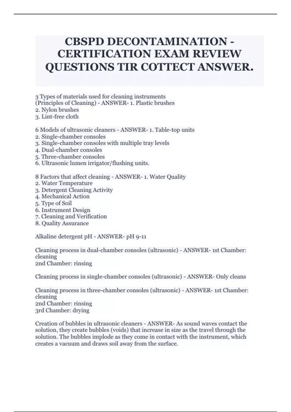 CBSPD DECONTAMINATION - CERTIFICATION EXAM REVIEW QUESTIONS TIR COTTECT ANSWER.