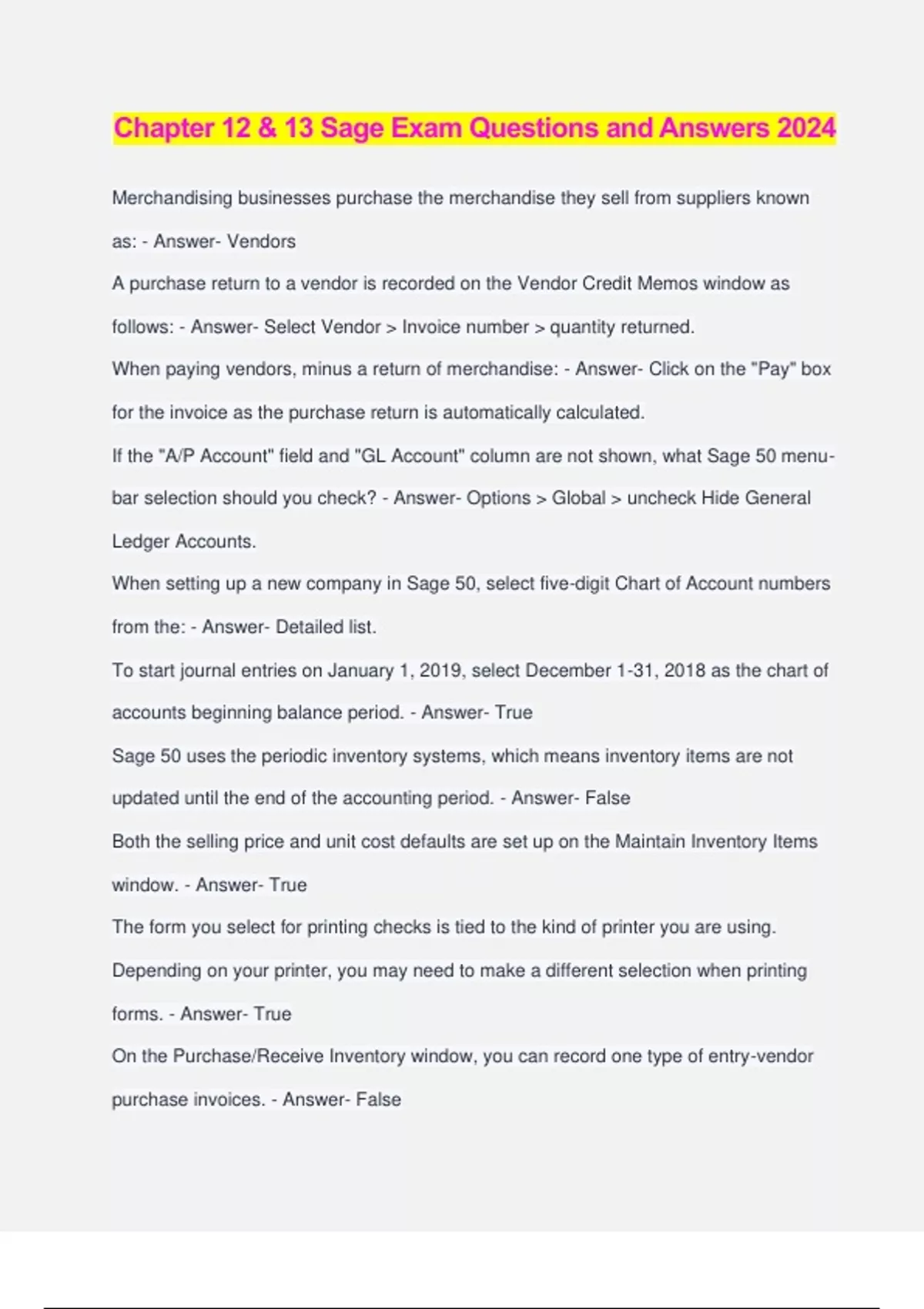Chapter 12 & 13 Sage Exam Questions and Answers 2024 Merchandising businesses purchase the merchandise they sell from suppliers known as: - Answer- Vendors A purchase return to a vendor is recorded on the Vendor Credit Memos window as follows: - Answer- Select Vendor > Invoice number > quantity returned. When paying vendors, minus a return of merchandise: - Answer- Click on the "Pay" box for the invoice as the purchase return is automatically calculated. If the "A/P Account" field and "GL Account" column are not shown, what Sage 50 menu- bar selection should you check? - Answer- Options > Global > uncheck Hide General Ledger Accounts. When setting up a new company in Sage 50, select five-digit Chart of Account numbers from the: - Answer- Detailed list. To start journal entries on January 1, 2019, select December 1-31, 2018 as the chart of accounts beginning balance period. - Answer- True Sage 50 uses the periodic inventory systems, which means inventory items are not updated until the end of the accounting period. - Answer- False Both the selling price and unit cost defaults are set up on the Maintain Inventory Items window. - Answer- True The form you select for printing checks is tied to the kind of printer you are using. Depending on your printer, you may need to make a different selection when printing forms. - Answer- True On the Purchase/Receive Inventory window, you can record one type of entry-vendor purchase invoices. - Answer- False In Chapter 13, to make sure you are starting in the correct place in the data display the following reports: - Answer- Chapter 12's general ledger trial balance. The Maintain Customer/Prospects window allows