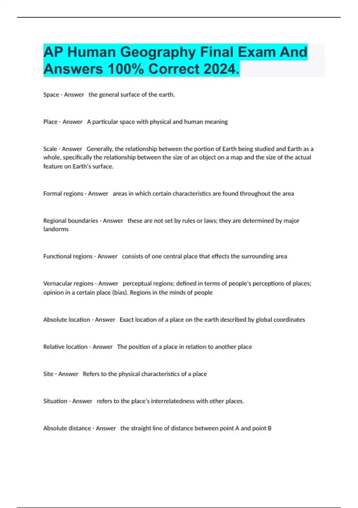 AP Human Geography Final Exam And Answers 100% Correct 2024.