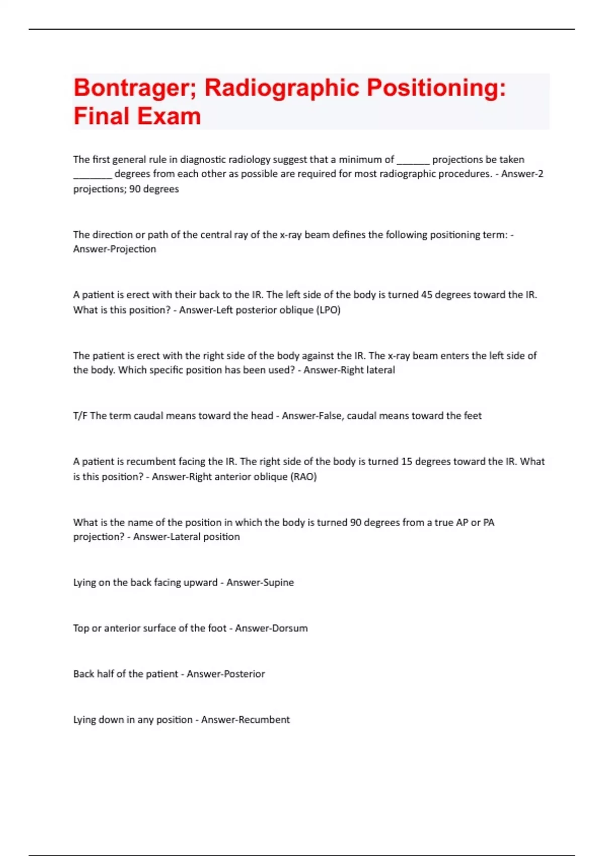 Bontrager; Radiographic Positioning: Final Exam Questions And Answers With Complete Updates