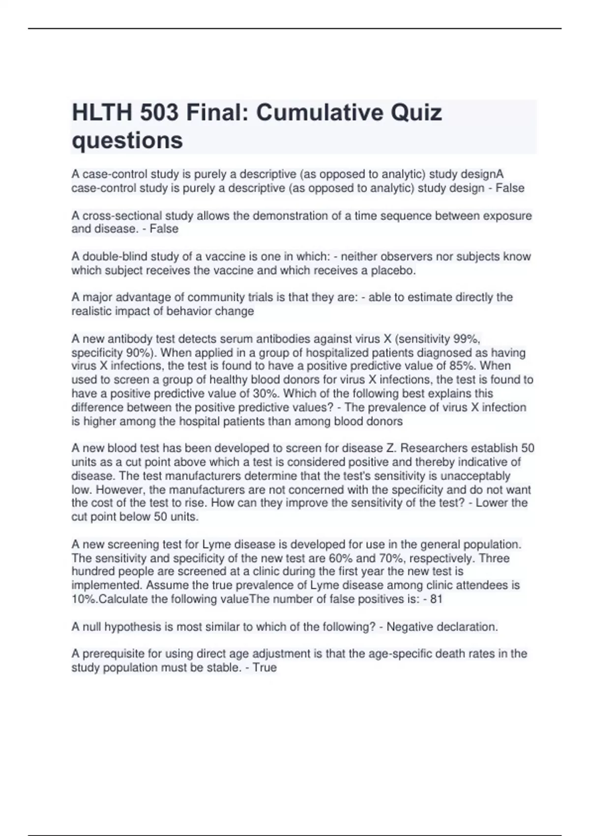 A case-control study is purely a descriptive (as opposed to analytic) study designA case-control study is purely a descriptive (as opposed to analytic) study design - False A cross-sectional study allows the demonstration of a time sequence between exposure and disease. - False A double-blind study of a vaccine is one in which: - neither observers nor subjects know which subject receives the vaccine and which receives a placebo. A major advantage of community trials is that they are: - able to estimate directly the realistic impact of behavior change A new antibody test detects serum antibodies against virus X (sensitivity 99%, specificity 90%). When applied in a group of hospitalized patients diagnosed as having virus X infections, the test is found to have a positive predictive value of 85%. When used to screen a group of healthy blood donors for virus X infections, the test is found to have a positive predictive value of 30%. Which of the following best explains this difference between the positive predictive values? - The prevalence of virus X infection is higher among the hospital patients than among blood donors A new blood test has been developed to screen for disease Z. Researchers establish 50 units as a cut point above which a test is considered positive and thereby indicative of disease. The test manufacturers determine that the test's sensitivity is unacceptably low. However, the manufacturers are not concerned with the specificity and do not want the cost of the test to rise. How can they improve the sensitivity of the test? - Lower the cut point below 50 units. A new screening test for Lyme disease is developed for use in the general population. The sensitivity and specificity of the new test are 60% and 70%, respectively. Three hundred people are screened at a clinic during the first year the new test is implemented. Assume the true prevalence of Lyme disease among clinic attendees is 10%.Calculate the following valueThe number of false positives is: - 81