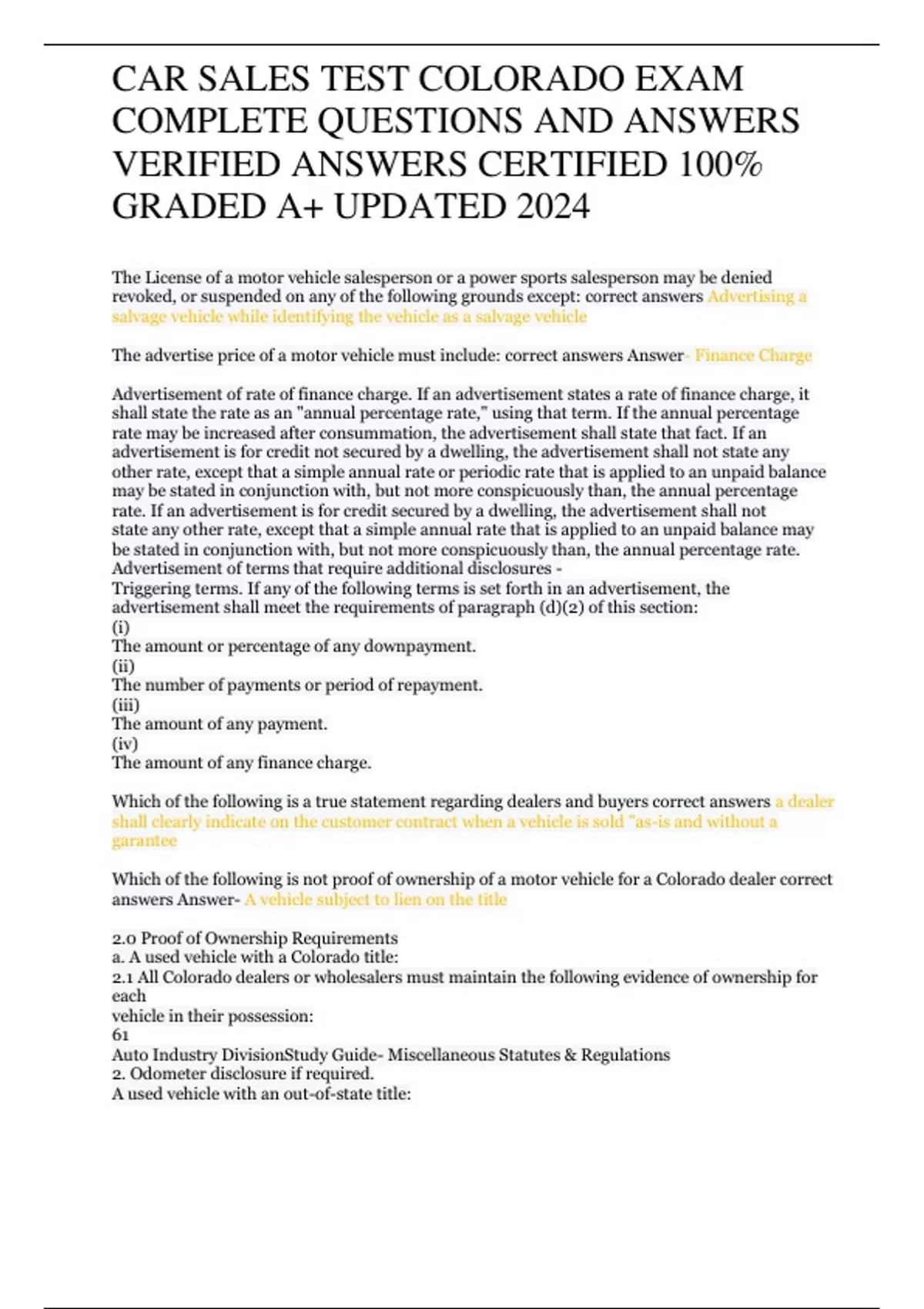 CAR SALES TEST COLORADO EXAM COMPLETE QUESTIONS AND ANSWERS VERIFIED ANSWERS CERTIFIED 100% GRADED A+ UPDATED 2024 CAR SALES TEST COLORADO EXAM COMPLETE QUESTIONS AND ANSWERS VERIFIED ANSWERS CERTIFIED 100% GRADED A+ UPDATED 2024 CAR SALES TEST COLORADO EXAM COMPLETE QUESTIONS AND ANSWERS VERIFIED ANSWERS CERTIFIED 100% GRADED A+ UPDATED 2024