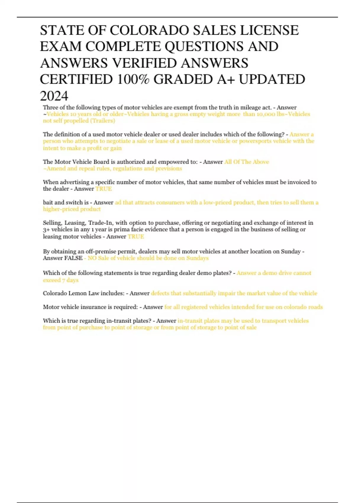 STATE OF COLORADO SALES LICENSE EXAM COMPLETE QUESTIONS AND ANSWERS VERIFIED ANSWERS CERTIFIED 100% GRADED A+ UPDATED 2024