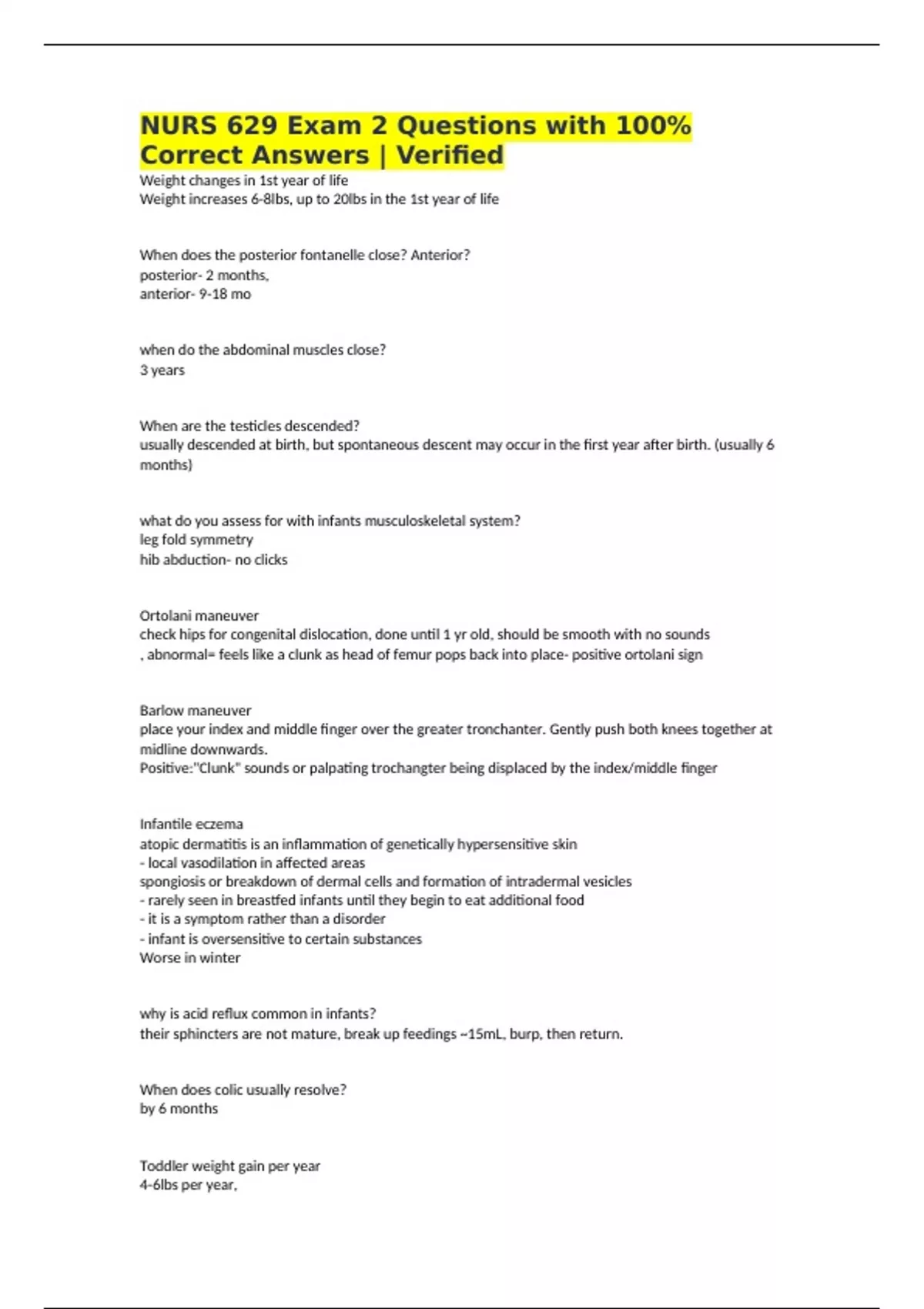 NURS 629 Exam 2 Questions with 100% Correct Answers | Verified Weight changes in 1st year of life Weight increases 6-8lbs, up to 20lbs in the 1st year of life When does the posterior fontanelle close? Anterior? posterior- 2 months, anterior- 9-18 mo when do the abdominal muscles close? 3 years When are the testicles descended? usually descended at birth, but spontaneous descent may occur in the first year after birth. (usually 6 months) what do you assess for with infants musculoskeletal system? leg fold symmetry hib abduction- no clicks Ortolani maneuver check hips for congenital dislocation, done until 1 yr old, should be smooth with no sounds , abnormal= feels like a clunk as head of femur pops back into place- positive ortolani sign Barlow maneuver place your index and middle finger over the greater tronchanter. Gently push both knees together at midline downwards. Positive:"Clunk" sounds or palpating trochangter being displaced by the index/middle finger Infantile eczema atopic dermatitis is an inflammation of genetically hypersensitive skin - local vasodilation in affected areas spongiosis or breakdown of dermal cells and formation of intradermal vesicles - rarely seen in breastfed infants until they begin to eat additional food - it is a symptom rather than a disorder - infant is oversensitive to certain substances Worse in winter why is acid reflux common in infants? their sphincters are not mature, break up feedings ~15mL, burp, then return. When does colic usually resolve? by 6 months Toddler weight gain per year