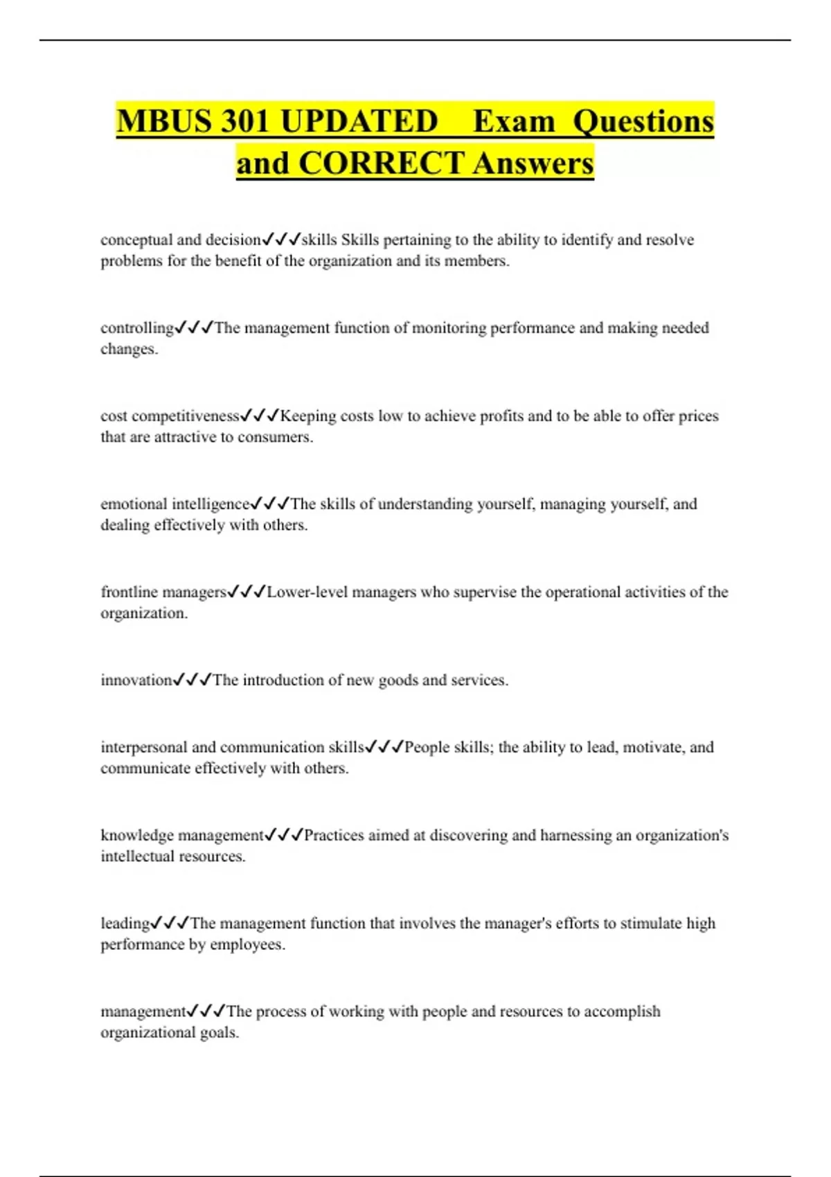 MBUS 301 UPDATED Exam Questions and CORRECT Answers