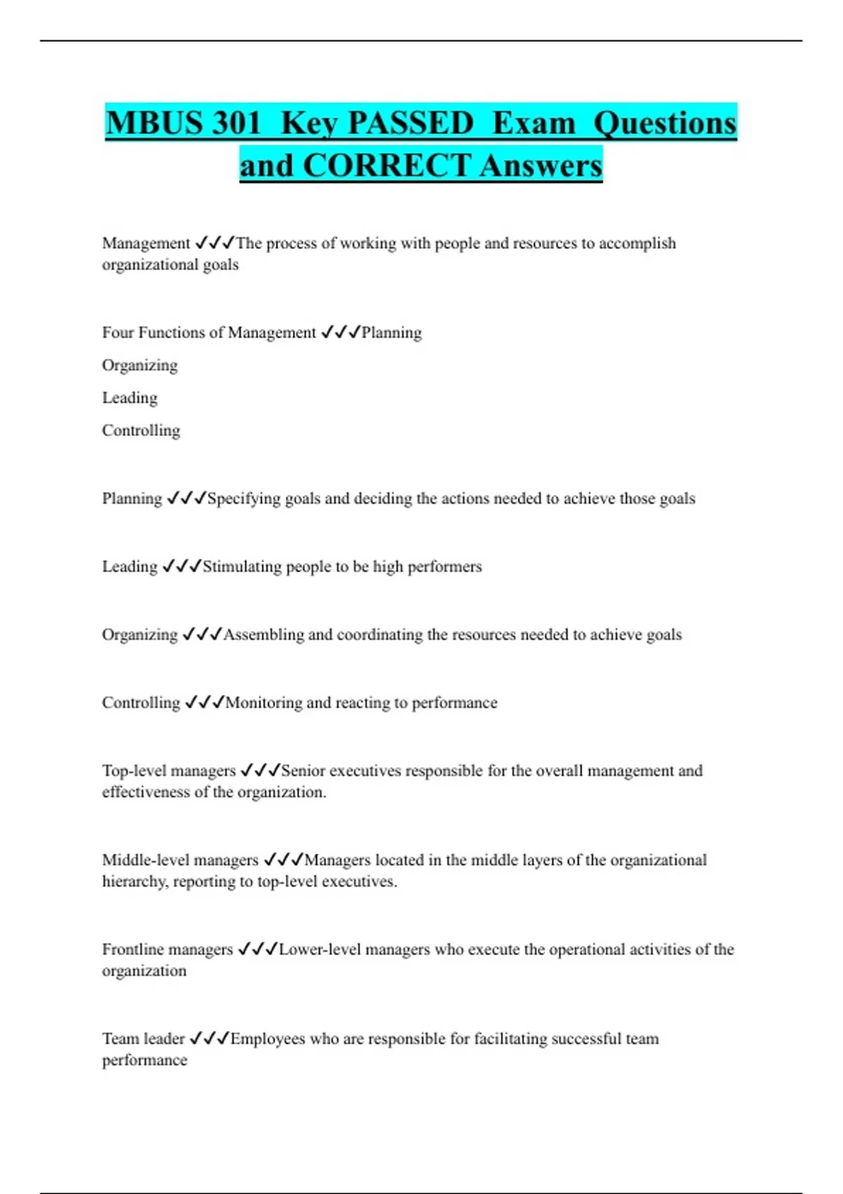 MBUS 301 Key PASSED Exam Questions and CORRECT Answers