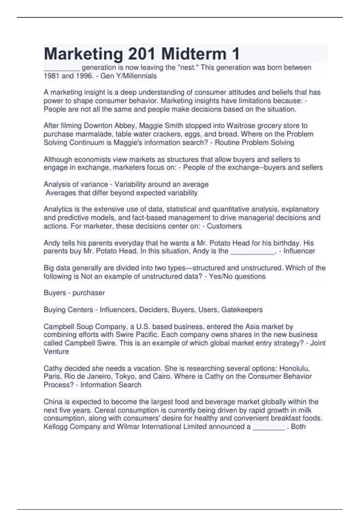 _________ generation is now leaving the "nest." This generation was born between 1981 and 1996. - Gen Y/Millennials A marketing insight is a deep understanding of consumer attitudes and beliefs that has power to shape consumer behavior. Marketing insights have limitations because: - People are not all the same and people make decisions based on the situation. After filming Downton Abbey, Maggie Smith stopped into Waitrose grocery store to purchase marmalade, table water crackers, eggs, and bread. Where on the Problem Solving Continuum is Maggie's information search? - Routine Problem Solving Although economists view markets as structures that allow buyers and sellers to engage in exchange, marketers focus on: - People of the exchange--buyers and sellers Analysis of variance - Variability around an average Averages that differ beyond expected variability Analytics is the extensive use of data, statistical and quantitative analysis, explanatory and predictive models, and fact-based management to drive managerial decisions and actions. For marketer, these decisions center on: - Customers Andy tells his parents everyday that he wants a Mr. Potato Head for his birthday. His parents buy Mr. Potato Head. In this situation, Andy is the ___________. - Influencer Big data generally are divided into two types—structured and unstructured. Which of the following is Not an example of unstructured data? - Yes/No questions Buyers - purchaser Buying Centers - Influencers, Deciders, Buyers, Users, Gatekeepers Campbell Soup Company, a U.S. based business, entered the Asia market by combining efforts with Swire Pacific. Each company owns shares in the new business called Campbell Swire. This is an example of which global market entry strategy? - Joint Venture Cathy decided she needs a vacation. She is researching several options: Honolulu, Paris, Rio de Janeiro, Tokyo, and Cairo. Where is Cathy on the Consumer Behavior Process? - Information Search China is expected to become the largest food and beverage market globally within the next five years. Cereal consumption is currently being driven by rapid growth in milk consumption, along with consumers' desire for healthy and convenient breakfast foods. Kellogg Company and Wilmar International Limited announced a ________ . Both
