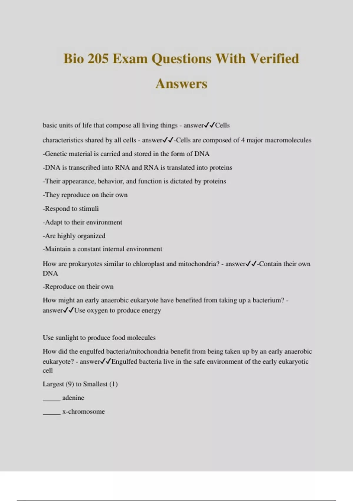 Bio 205 Exam Questions With Verified Answers basic units of life that compose all living things - answerCells characteristics shared by all cells - answer-Cells are composed of 4 major macromolecules -Genetic material is carried and stored in the form of DNA -DNA is transcribed into RNA and RNA is translated into proteins -Their appearance, behavior, and function is dictated by proteins -They reproduce on their own -Respond to stimuli -Adapt to their environment -Are highly organized -Maintain a constant internal environment How are prokaryotes similar to chloroplast and mitochondria? - answer-Contain their own DNA -Reproduce on their own How might an early anaerobic eukaryote have benefited from taking up a bacterium? - answerUse oxygen to produce energy Use sunlight to produce food molecules How did the engulfed bacteria/mitochondria benefit from being taken up by an early anaerobic eukaryote? - answerEngulfed bacteria live in the safe environment of the early eukaryotic cell Largest (9) to Smallest (1) _____ adenine _____ x-chromosome _____ Phage _____ tRNA _____ sperm _____ coffee bean _____ sesame seed _____ mitochondria _____ E.coli bacterium - answer9- coffee bean 8- sesame seed 7- sperm 6- X chromosome 5- mitochondria 4- E. coli 3- phage 2- tRNA 1- adenine Cell ___________ fits ____________. - answerstructure, function Four methods to lysing cells - answer-High frequency sound lyses cells -Mechanical force shears cells -Detergent lyses cells by puts holes in the plasma membrane -Cells forced through a small hole using high pressure break open What is the term used to describe the thick soup of cell extract produced when cell are broken open? - answerhomogenate What is the technique that separates a homogenate into different parts? - answercentrifugation _____________________: repeated centrifugation at different speeds separates cell components based on size and density - answerDifferential centrifugation ___________: a matrix of small beads that separates proteins according to charge, size, hydrophobicity, or ability to bind to a specific molecule. - answerChromatography What binds to column?