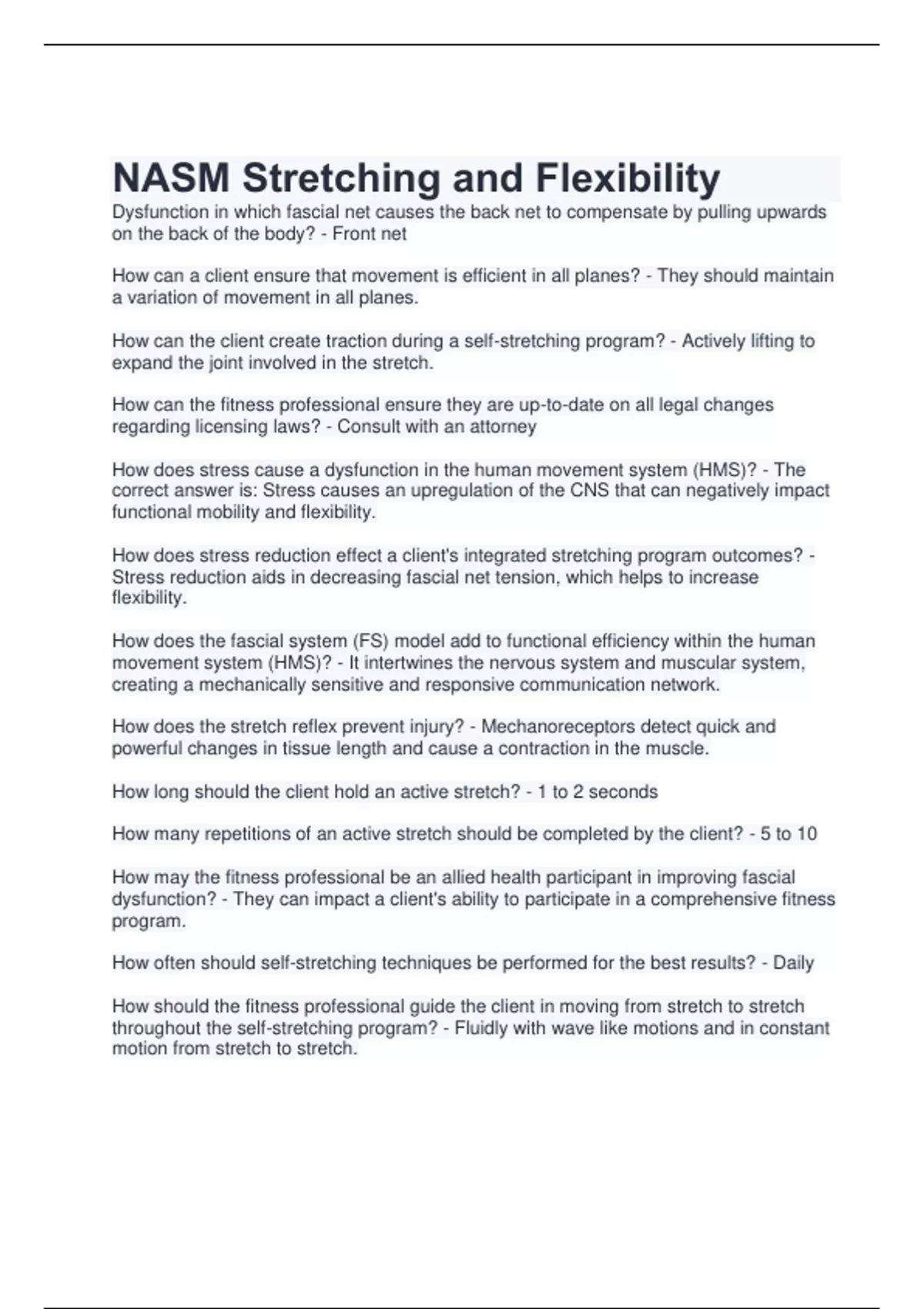 Dysfunction in which fascial net causes the back net to compensate by pulling upwards on the back of the body? - Front net How can a client ensure that movement is efficient in all planes? - They should maintain a variation of movement in all planes. How can the client create traction during a self-stretching program? - Actively lifting to expand the joint involved in the stretch. How can the fitness professional ensure they are up-to-date on all legal changes regarding licensing laws? - Consult with an attorney How does stress cause a dysfunction in the human movement system (HMS)? - The correct answer is: Stress causes an upregulation of the CNS that can negatively impact functional mobility and flexibility. How does stress reduction effect a client's integrated stretching program outcomes? - Stress reduction aids in decreasing fascial net tension, which helps to increase flexibility. How does the fascial system (FS) model add to functional efficiency within the human movement system (HMS)? - It intertwines the nervous system and muscular system, creating a mechanically sensitive and responsive communication network. How does the stretch reflex prevent injury? - Mechanoreceptors detect quick and powerful changes in tissue length and cause a contraction in the muscle. How long should the client hold an active stretch? - 1 to 2 seconds How many repetitions of an active stretch should be completed by the client? - 5 to 10 How may the fitness professional be an allied health participant in improving fascial dysfunction? - They can impact a client's ability to participate in a comprehensive fitness program. How often should self-stretching techniques be performed for the best results? - Daily How should the fitness professional guide the client in moving from stretch to stretch throughout the self-stretching program? - Fluidly with wave like motions and in constant motion from stretch to stretch.