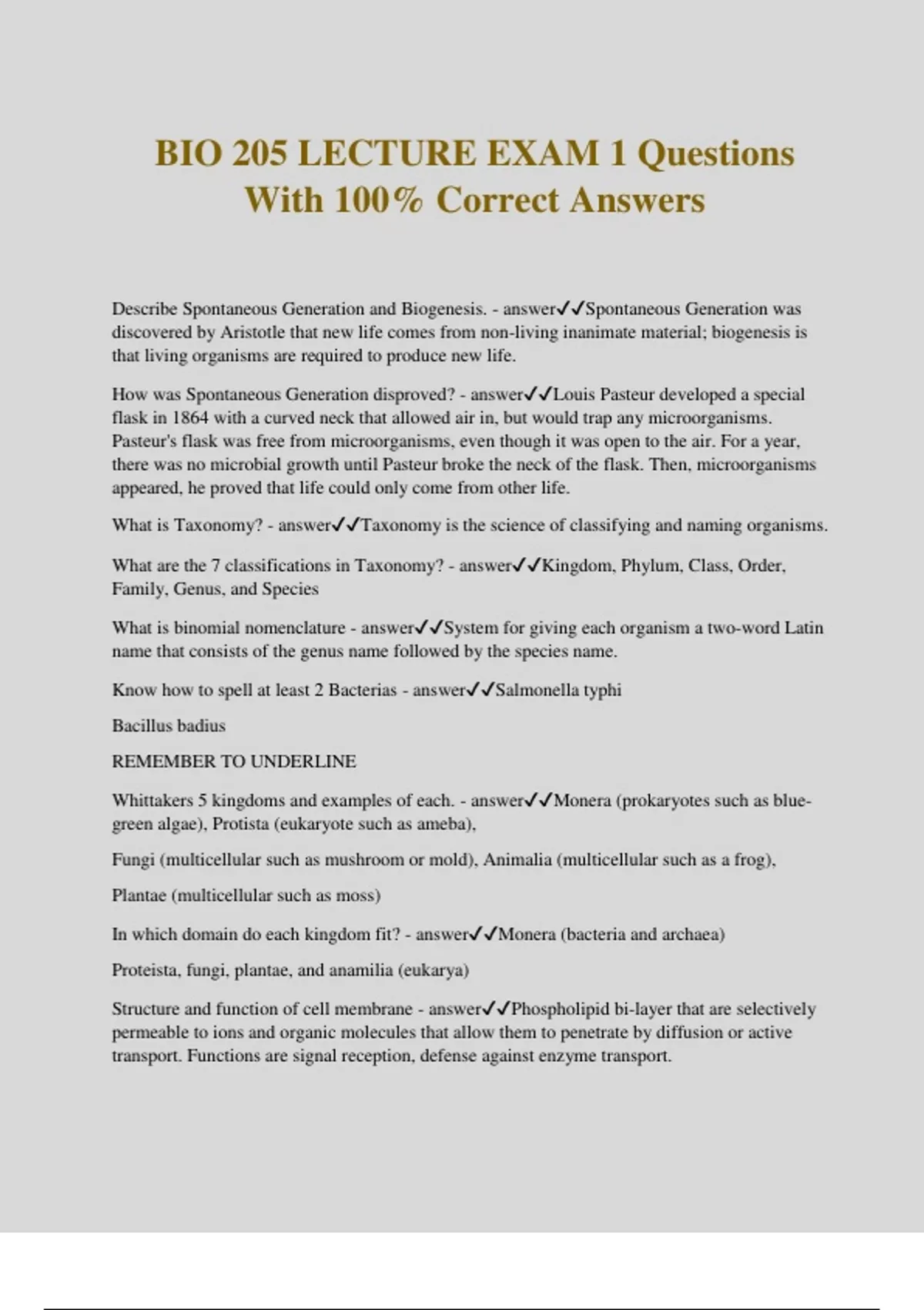 BIO 205 LECTURE EXAM 1 Questions With 100% Correct Answers Describe Spontaneous Generation and Biogenesis. - answerSpontaneous Generation was discovered by Aristotle that new life comes from non-living inanimate material; biogenesis is that living organisms are required to produce new life. How was Spontaneous Generation disproved? - answerLouis Pasteur developed a special flask in 1864 with a curved neck that allowed air in, but would trap any microorganisms. Pasteur's flask was free from microorganisms, even though it was open to the air. For a year, there was no microbial growth until Pasteur broke the neck of the flask. Then, microorganisms appeared, he proved that life could only come from other life. What is Taxonomy? - answerTaxonomy is the science of classifying and naming organisms. What are the 7 classifications in Taxonomy? - answerKingdom, Phylum, Class, Order, Family, Genus, and Species What is binomial nomenclature - answerSystem for giving each organism a two-word Latin name that consists of the genus name followed by the species name. Know how to spell at least 2 Bacterias - answerSalmonella typhi Bacillus badius REMEMBER TO UNDERLINE Whittakers 5 kingdoms and examples of each. - answerMonera (prokaryotes such as blue- green algae), Protista (eukaryote such as ameba), Fungi (multicellular such as mushroom or mold), Animalia (multicellular such as a frog), Plantae (multicellular such as moss) In which domain do each kingdom fit? - answerMonera (bacteria and archaea) Proteista, fungi, plantae, and anamilia (eukarya) Structure and function of cell membrane - answerPhospholipid bi-layer that are selectively permeable to ions and organic molecules that allow them to penetrate by diffusion or active transport. Functions are signal reception, defense against enzyme transport. Structure and function of fimbriae. - answerA type of pili that helps bacteria attach to surfaces; it is found in gram negative (-) bacteria Structure and function of pili. - answerTiny hollow projection used to attach bacteria to surfaces or for congregation. Structure and function of flagella - answerLong thin appendage on a bacterial cell that provides locomotion (movement). Monotrichous - answer1 flagella Amphitrichous - answer1 flagella at each end lophotrichous - answer2 or more flagella at one end or both ends of the cell Perotrichous - answer2 or more flagella all over the surface Axial filaments - answerUsed for mobility inside flagella. "internal flagella" inside cell wall; They contract and cause the cell to rotate; they occur only in spirochetes Define microbiology - answerThe study of microorganisms Microorganism - answerAny organism too small to be viewed by the unaided eye, as bacteria, protozoa, and some fungi and algae Eubacteria - answerTrue bacteria, causes human, animal, and plant disease. Involved in environmental processes. Important roles in industry. Includes cyanbacteria (blue-green algae). Contains polypeptides in cell walls...cocci. Bacilli, spiral forms common, Salmonella, Staphylococcus, E. coli, Streptococcus. Archaebacteria - answerDiscovered in 1977. Lack peptidoglycan in cell wall. Most are cocci, bacilli. Spiral is unusual Fungi - answerSingle celled yeast. Multicellular molds. Forms hyphae (long filaments). Human disease usually not serious, Skin infections; exception is valley fever. Protozoa - answerUnicellular to multicellular. Classified by locomotion (cilia, flagella, and pseudopods or false feet). Algae - answerUnicellular forms. Photosynthetic. Three classes: red, green, brown. Only one human pathogen causes disease; Prototheca (skin infection). Toxin production; red tide. Viruses - answerProtein shell and nucleic acid, Can use RNA or DNA. Requires host cell; parasite. Viroids - answerInfectious RNA molecule Prions - answerInfectious protein