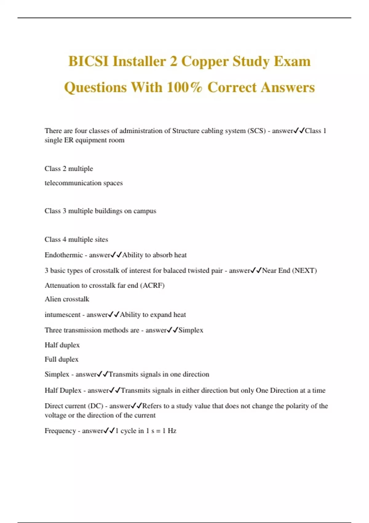 BICSI Installer 2 Copper Study Exam Questions With 100% Correct Answers There are four classes of administration of Structure cabling system (SCS) - answerClass 1 single ER equipment room Class 2 multiple telecommunication spaces Class 3 multiple buildings on campus Class 4 multiple sites Endothermic - answerAbility to absorb heat 3 basic types of crosstalk of interest for balaced twisted pair - answerNear End (NEXT) Attenuation to crosstalk far end (ACRF) Alien crosstalk intumescent - answerAbility to expand heat Three transmission methods are - answerSimplex Half duplex Full duplex Simplex - answerTransmits signals in one direction Half Duplex - answerTransmits signals in either direction but only One Direction at a time Direct current (DC) - answerRefers to a study value that does not change the polarity of the voltage or the direction of the current Frequency - answer1 cycle in 1 s = 1 Hz