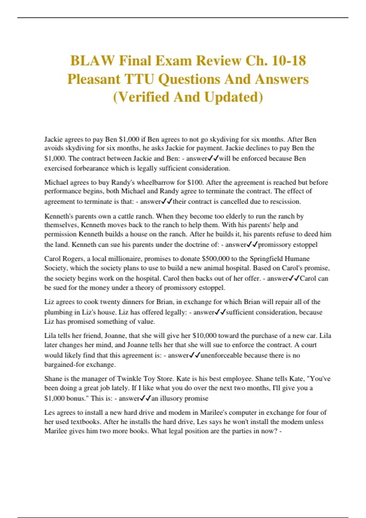 BLAW Final Exam Review Ch. 10-18 Pleasant TTU Questions And Answers (Verified And Updated) Jackie agrees to pay Ben $1,000 if Ben agrees to not go skydiving for six months. After Ben avoids skydiving for six months, he asks Jackie for payment. Jackie declines to pay Ben the $1,000. The contract between Jackie and Ben: - answerwill be enforced because Ben exercised forbearance which is legally sufficient consideration. Michael agrees to buy Randy's wheelbarrow for $100. After the agreement is reached but before performance begins, both Michael and Randy agree to terminate the contract. The effect of agreement to terminate is that: - answertheir contract is cancelled due to rescission. Kenneth's parents own a cattle ranch. When they become too elderly to run the ranch by themselves, Kenneth moves back to the ranch to help them. With his parents' help and permission Kenneth builds a house on the ranch. After he builds it, his parents refuse to deed him the land. Kenneth can sue his parents under the doctrine of: - answerpromissory estoppel Carol Rogers, a local millionaire, promises to donate $500,000 to the Springfield Humane Society, which the society plans to use to build a new animal hospital. Based on Carol's promise, the society begins work on the hospital. Carol then backs out of her offer. - answerCarol can be sued for the money under a theory of promissory estoppel. Liz agrees to cook twenty dinners for Brian, in exchange for which Brian will repair all of the plumbing in Liz's house. Liz has offered legally: - answersufficient consideration, because Liz has promised something of value. Lila tells her friend, Joanne, that she will give her $10,000 toward the purchase of a new car. Lila later changes her mind, and Joanne tells her that she will sue to enforce the contract. A court would likely find that this agreement is: - answerunenforceable because there is no bargained-for exchange. Shane is the manager of Twinkle Toy Store. Kate is his best employee. Shane tells Kate, "You've been doing a great job lately. If I like what you do over the next two months, I'll give you a $1,000 bonus." This is: - answeran illusory promise Les agrees to install a new hard drive and modem in Marilee's computer in exchange for four of her used textbooks. After he installs the hard drive, Les says he won't install the modem unless Marilee gives him two more books. What legal position are the parties in now? - answerMarilee can sue for breach of contract, because Les had a preexisting duty to do all of the work. Tom agrees to hire Dave for a salary $3,000 a month as a consultant. Tom reserves the right to cancel the contract at any time. Before Dave begins his consultant job, Tom cancels the contract with Dave and hires Stanley. Tom can: - answercancel the contract because the contract is illusory. An inmate escapes from the county prison. There is a $500 reward offered for any information leading to the capture of the inmate. The county sheriff sees the inmate at a local restaurant and calls the department headquarters before arresting the inmate. The sheriff: - answercannot expect to collect the $500 because he had a preexisting duty to arrest the inmate. Madeline signs a contract agreeing to sell Norman her brand-new Porsche 911 automobile for $50. It is possible that a court will: - answerlook more closely at the bargain to determine whether fraud, duress, or undue influence was involved. Morgan signs an installment loan contract with her banker. The contract specifies that Morgan will pay 3.00% interest every month on the borrowed amount of $50,000 for two years. Both Morgan and the banker know the precise amount of the total obligation. This is an example of: - answerliquidated debt. Julia promises to give Mary a piece of original artwork worth $5,000 in return for Mary's stamp collection, which is worth $500. After the exchange, Julia decides that she does not think the bargain was fair and demands that Mary give her back the painting. A court will most likely: - answernot interfere with the contract, because the consideration is legally sufficient. Francisco is driving his car when he collides with Wyatt's car. Francisco writes Wyatt a letter in which he offers to pay Wyatt $5,000 if Wyatt will agree to forfeit all of his rights to pursue a lawsuit against Francisco for this accident. If Wyatt agrees and signs the letter, they will have a: - answerrelease Jane agrees to cook twenty dinners for Ryan, and in exchange, Ryan will repair all the plumbing in Jane's house. Jane has offered legally: - answersufficient consideration, because Jane has promised something of value. T or F: Courts generally presume the existence of contractual capacity. - answerTrue Disaffirmance - answerThe legal avoidance, or setting aside of contractual obligations. Age of Majority - answerThe age at which an individual is considered legally capable of conducting himself or herself responsibly. Emancipation - answerIn regard to minors, the act of being freed from parental control; occurs when a child's parent or legal guardian relinquishes the legal right to exercise control over the child.