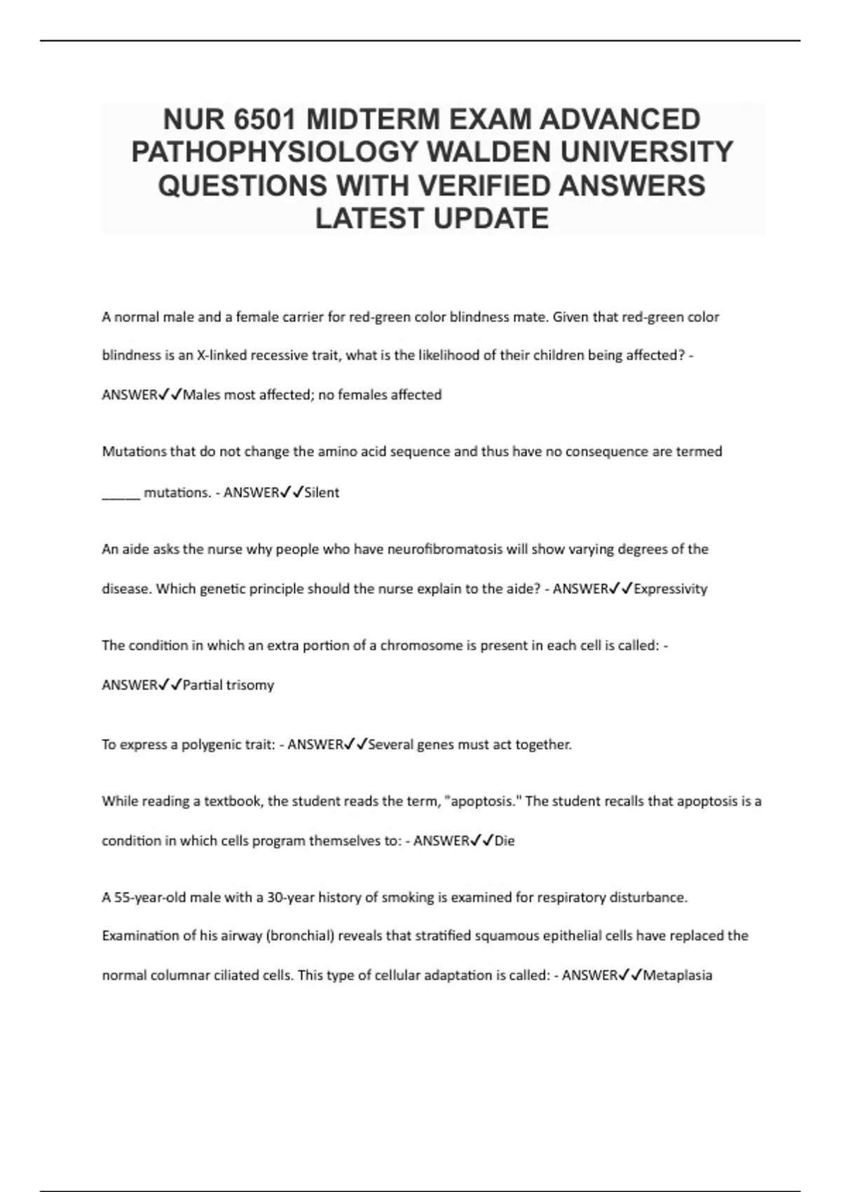 NUR 6501 MIDTERM EXAM ADVANCED PATHOPHYSIOLOGY WALDEN UNIVERSITY QUESTIONS WITH VERIFIED ANSWERS LATEST UPDATE