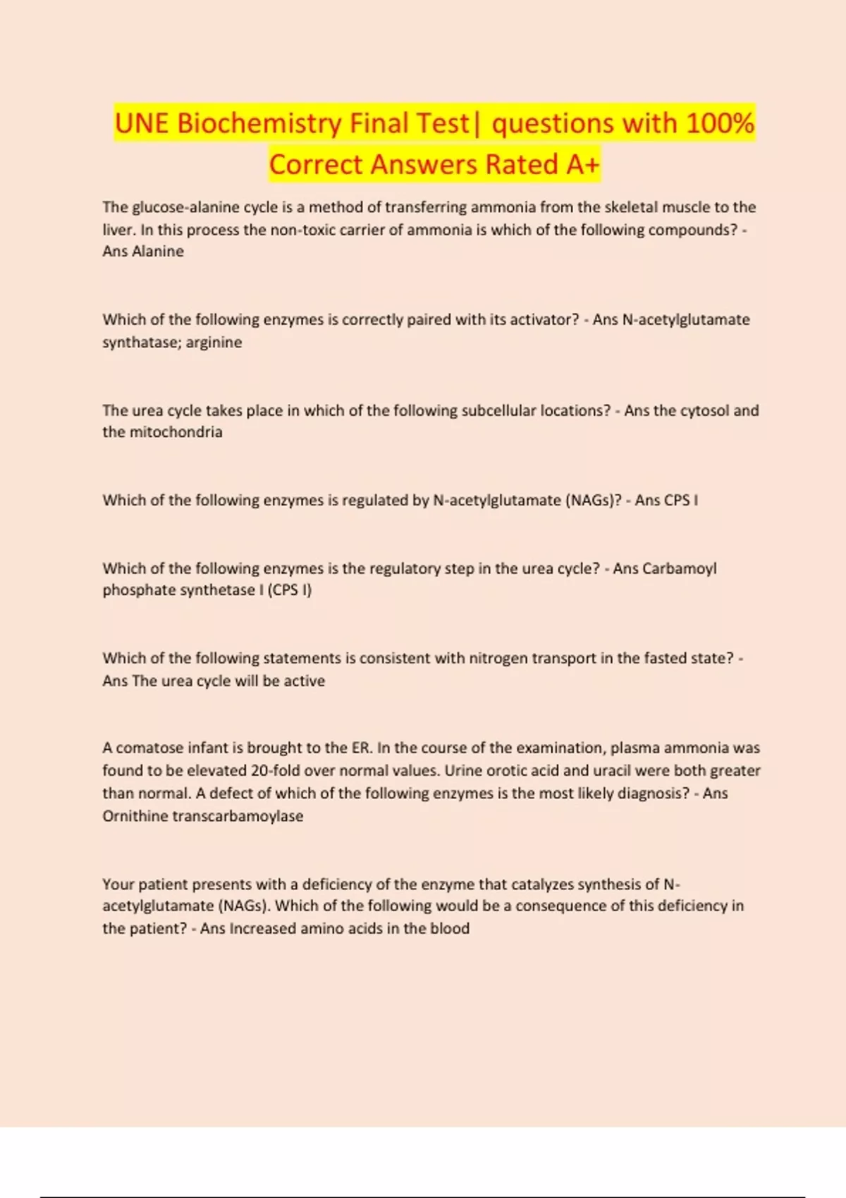 UNE Biochemistry Final Test| questions with 100% Correct Answers Rated A+