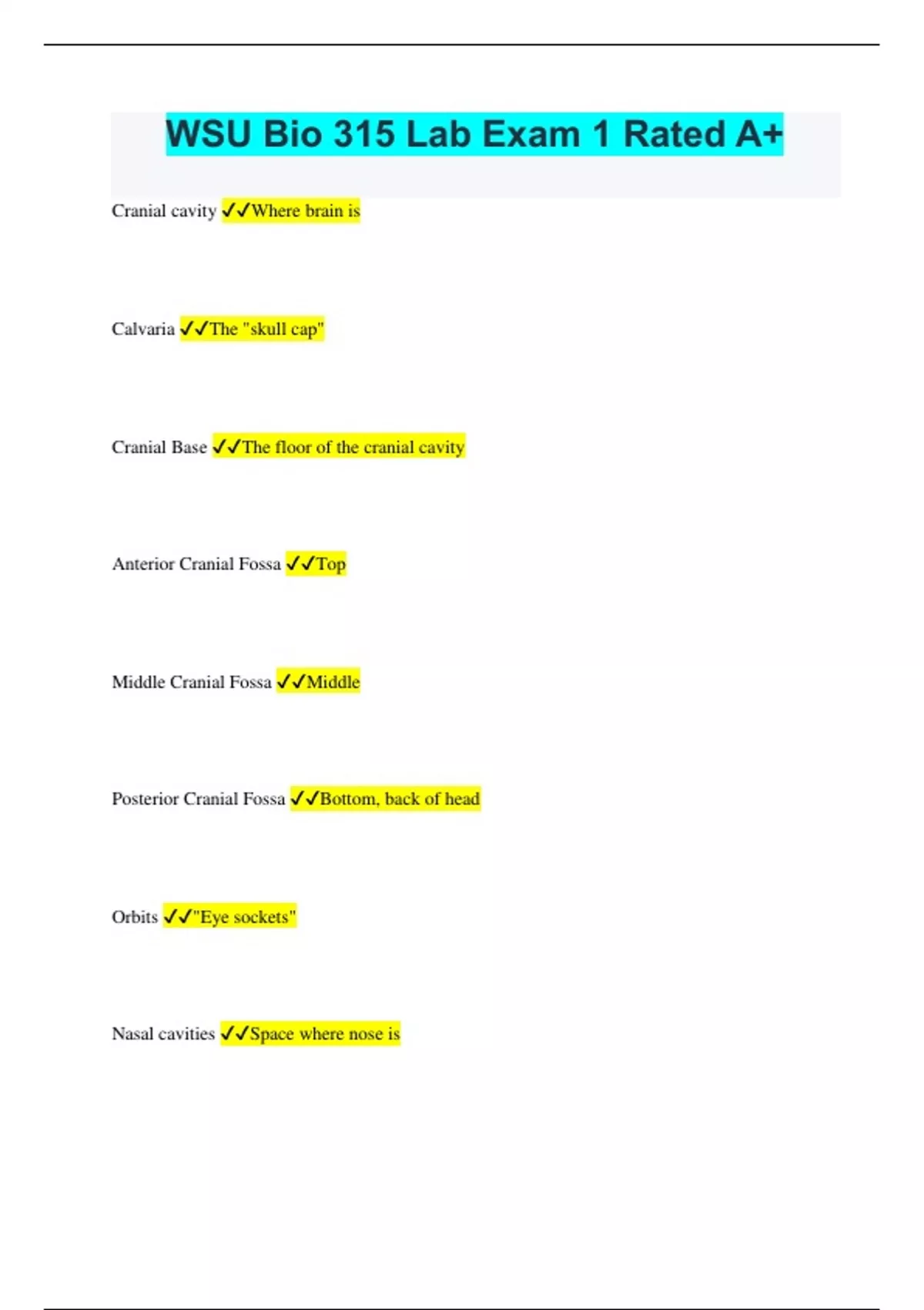 WSU Bio 315 Lab Exam 1 Rated A+ Cranial cavity Where brain is Calvaria The "skull cap" Cranial Base The floor of the cranial cavity Anterior Cranial Fossa Top Middle Cranial Fossa Middle Posterior Cranial Fossa Bottom, back of head Orbits "Eye sockets" Nasal cavities Space where nose is Bony nasal septum Line down center, divides Piriform aperture Piriform = pear shaped Outside/outline of nose Hard palate Roof of mouth, "brain freeze" Zygomatic arch Bone in cheek Infratemporal fossa Space behind zygomatic arch Coronal Suture Corona = crown, where crown would sit on head, side to side front Lambdoidal Suture Shaped like the Greek letter lambda, curved back Sagittal Suture Sagittarius is the archer--think of an arrow, straight down center, cuts in half Squamous Suture Scaly (like fish), side of skull, where ear would be Supraorbital Margin Above eye Parietal Bones Top of head Occipital Bone Back of head External Occipital Protuberance Occipital Condyles Articulate with the first cervical vertebra, bumps on back, smooth Nuchal lines Nucha = nape of neck, back side Mastoid Process Behind zygomatic processes Styloid Process Pointy, medial anterior