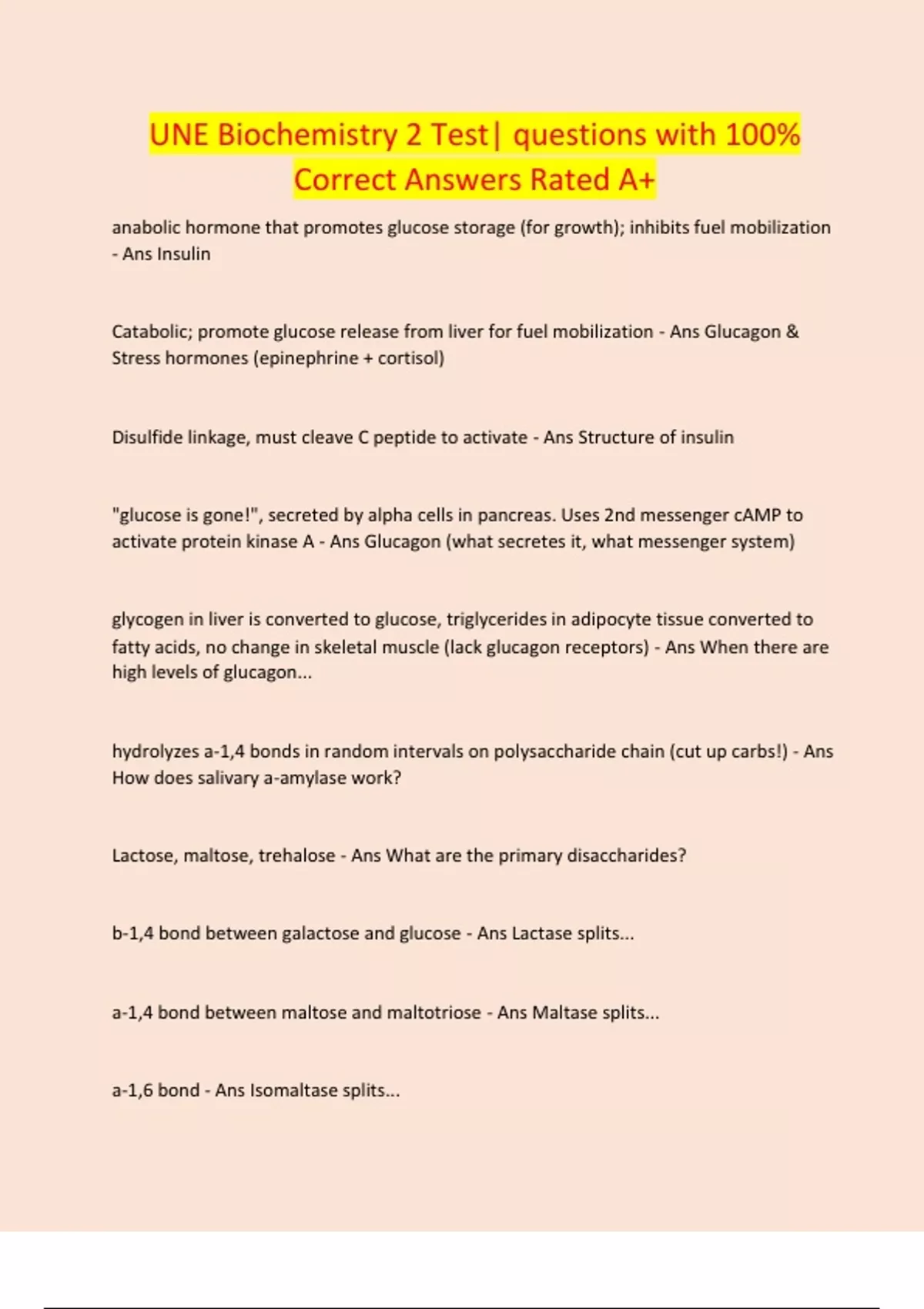 UNE Biochemistry 2 Test| questions with 100% Correct Answers Rated A+