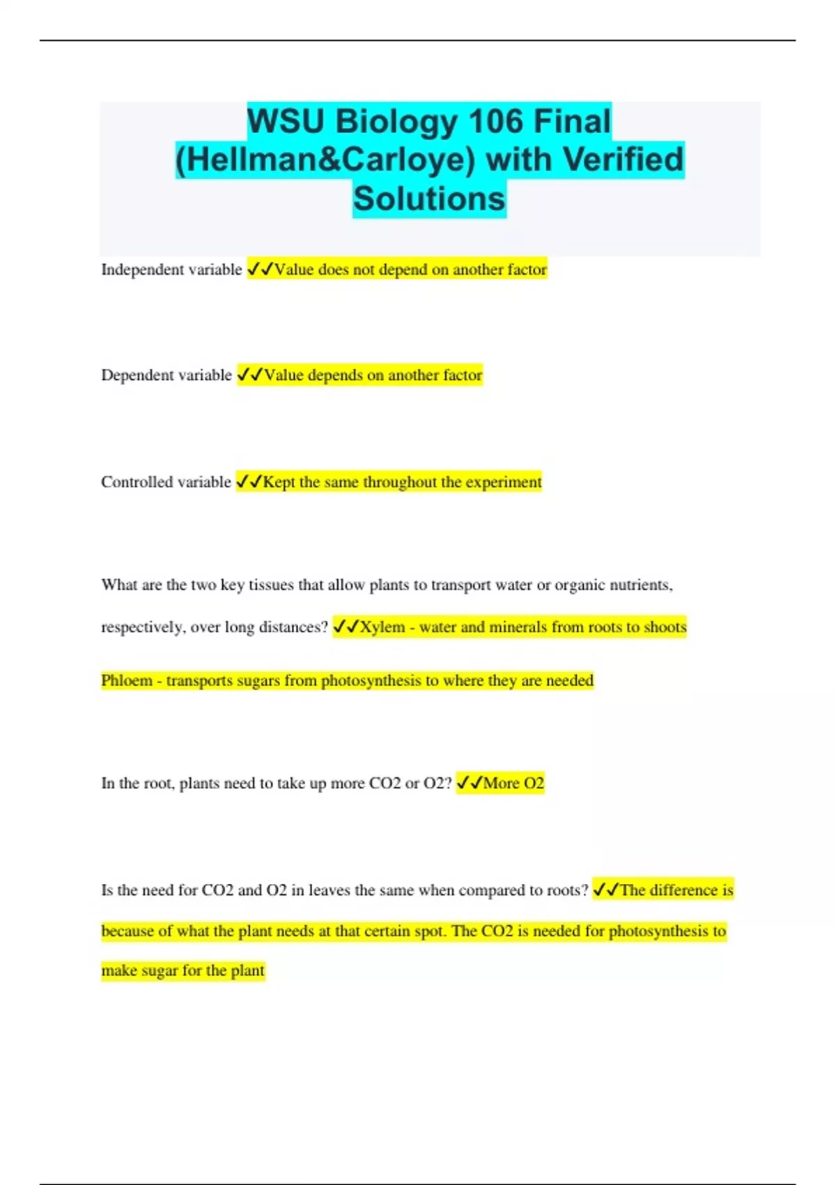 WSU Biology 106 Final (Hellman&Carloye) with Verified Solutions Independent variable Value does not depend on another factor Dependent variable Value depends on another factor Controlled variable Kept the same throughout the experiment What are the two key tissues that allow plants to transport water or organic nutrients, respectively, over long distances? Xylem - water and minerals from roots to shoots Phloem - transports sugars from photosynthesis to where they are needed In the root, plants need to take up more CO2 or O2? More O2 Is the need for CO2 and O2 in leaves the same when compared to roots? The difference is because of what the plant needs at that certain spot. The CO2 is needed for photosynthesis to make sugar for the plant Why do you think there is/is not a difference in gas exchange when you compare roots with leaves? If you look at the apoplast and the symplast, which of the following statements are true? In the apoplastic route water and solute move along the continuum of cell walls and extracellular spaces If you add sugar to water does the water potential increase or decrease? Decrease How is osmosis defined? Diffusion of free water What is a protoplast? Living part of the cell which includes plasma membrane How would you define transpiration? Loss of water vapor through cells The Casparian Strip is located in the endodermis. What is its function? Blocks passive flow of materials into the root vascular tissue of the plant What are rhizobia They can generate ammonia from atmospheric nitrogen Why are rhizobacteria beneficial for plants? They promote growth through chemicals they produce and they also produce antibodies that protect the roots from disease. Absorb toxic metals Why are rhizobacteria beneficial for agriculture? They can increase crop yield and reduce the amount of fertilizer and pesticides needed What is a nodule and what is the reason why they appear sometimes reddish? It is composed of plant cells that have been "infected" by Rhizobium. They appear reddish because of a molecule named leghemoglobin, an iron containing protein that binds reversibly to oxygen. Similar to the hemoglobin in humans red blood cells What does the enzyme 'nitrogenase' catalyze? Atmospheric nitrogen to ammonia What is the difference between endo- and ectomycorrhizae? Ecto do not penetrate the root cortex, whereas endo grow into the invaginations of the root cell membranes called arbuscules Do the mycorrhiaze have a symbiotic or mutualistic relationship Mutualistic Why have some plants adapted to a carnivorous live style They lack some of the minerals so they eat insects. Most of it is because of poor nitrogen in the soil How many elements have been found in plants, and how many of these are considered to be 'essential'? 17 and 9 are essential Based on a plant's dry mass, what are the four most common macronutrients found in plants? Carbon, oxygen, hydrogen, nitrogen How can you distinguish a plant that suffers from phosphorus deficiency versus a nitrogen- deficient plants Phosphorus - reddish purple margins Nitrogen - yellowing of plant at the tip and going towards the center of plant What is 'humus' and why is it important for the plant? The remains of dead organisms and other organic matter. It is important to the plant to fertilize it What are 'loams', and why is it important for soil to be loamy? The most fertile topsoil, it is important because in loams there is enough space to deliver oxygen to the roots. Made up of sand silt and clay Why is pH such an important factor for soil quality? It is important because if the soil is to acidic then a molecule might bond to the soil to much