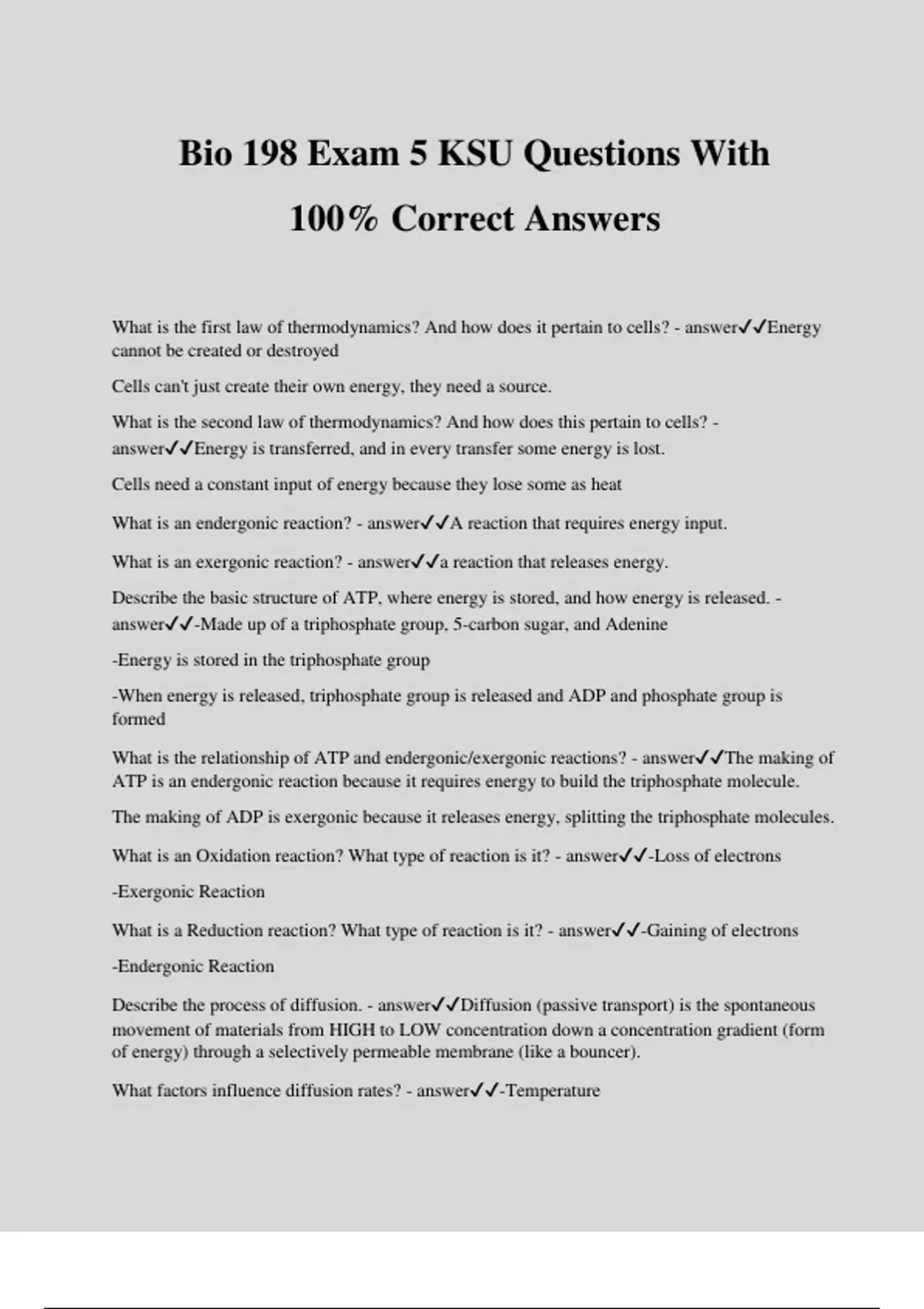 Bio 198 Exam 5 KSU Questions With 100% Correct Answers What is the first law of thermodynamics? And how does it pertain to cells? - answerEnergy cannot be created or destroyed Cells can't just create their own energy, they need a source. What is the second law of thermodynamics? And how does this pertain to cells? - answerEnergy is transferred, and in every transfer some energy is lost. Cells need a constant input of energy because they lose some as heat What is an endergonic reaction? - answerA reaction that requires energy input. What is an exergonic reaction? - answera reaction that releases energy. Describe the basic structure of ATP, where energy is stored, and how energy is released. - answer-Made up of a triphosphate group, 5-carbon sugar, and Adenine -Energy is stored in the triphosphate group -When energy is released, triphosphate group is released and ADP and phosphate group is formed What is the relationship of ATP and endergonic/exergonic reactions? - answerThe making of ATP is an endergonic reaction because it requires energy to build the triphosphate molecule. The making of ADP is exergonic because it releases energy, splitting the triphosphate molecules. What is an Oxidation reaction? What type of reaction is it? - answer-Loss of electrons -Exergonic Reaction What is a Reduction reaction? What type of reaction is it? - answer-Gaining of electrons -Endergonic Reaction Describe the process of diffusion. - answerDiffusion (passive transport) is the spontaneous movement of materials from HIGH to LOW concentration down a concentration gradient (form of energy) through a selectively permeable membrane (like a bouncer). What factors influence diffusion rates? - answer-Temperature -size of molecule -time -distance -Solubility -Surface Areaof membrane -Solvent density What is a selective permeable membrane? How does it influence movement of materials, and what molecules can move through easily? - answerThe membrane chooses which molecules are allowed to pass. Only allows smaller molecules (ie. oxygen and carbon dioxide) can move through easily What is facilitated diffusion? - answerThe movement of molecules across plasma using concentration gradient and a channel protein. does not require energy High to low concentration What is active transport? - answerATP is used to move molecules through protein channel across the membrane, moves LOW to HIGH concentration. used energy input. What is osmosis? - answermovement of water across a selectively permeable membrane, always moves high to low concentration so the solute can't pass through but the water can. What is a hypertonic solution? - answerA solution with higher concentration of solutes (usually salt) than water. What is Tonicity? - answerMeasure of the osmotic pressure of 2 solutions separated by a semipermeable membrane. T/F: Water tends to move towards areas that have a lower concentration of solutes. - answerFalse: water moves towards higher concentrations of solutes. What is an isotonic solution? - answerA solution that has an equal concentration of solute (usually salt) and water. What is a hypotonic solution? - answerA solution that has a lower concentration of solute (usually salt) than water.