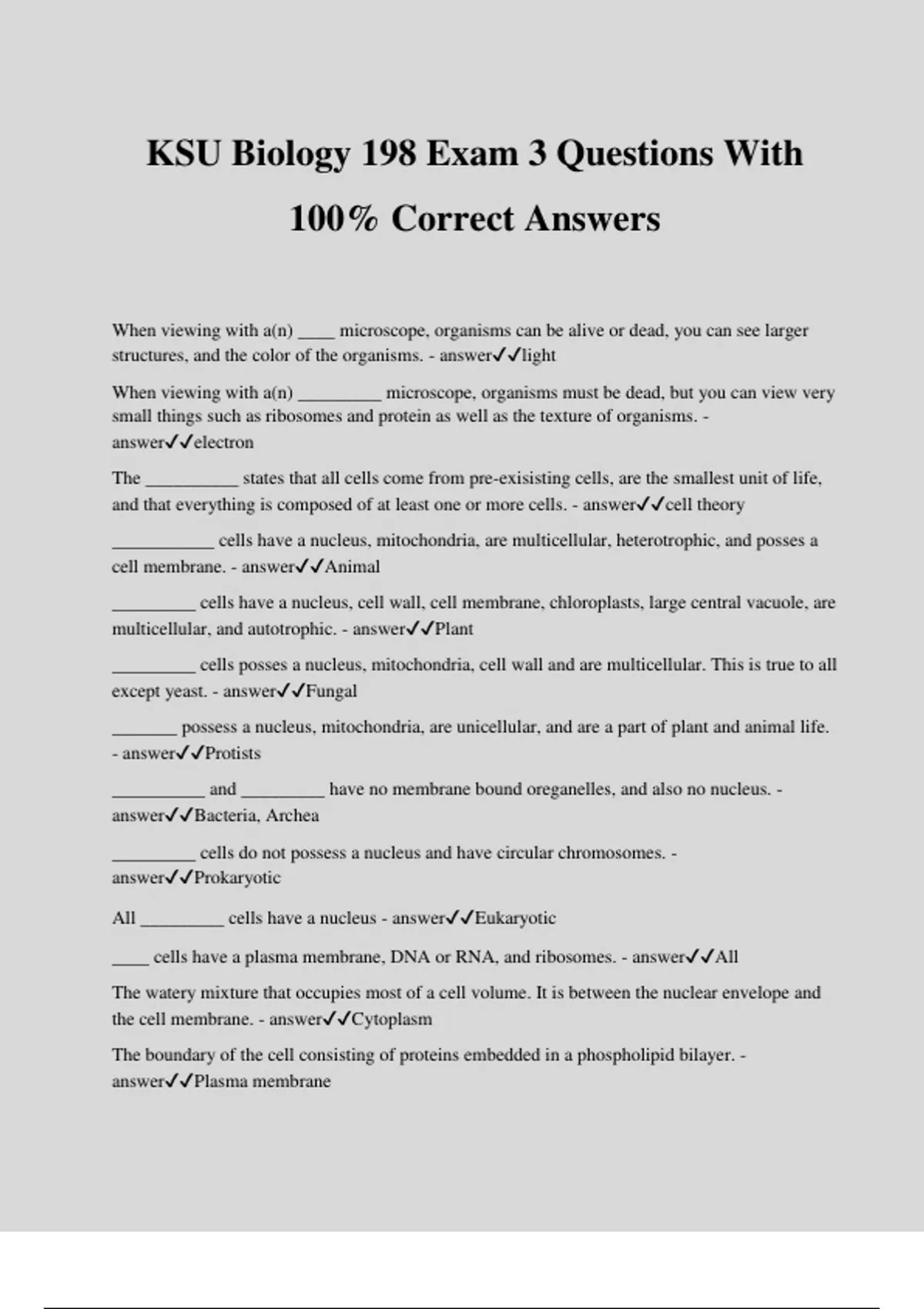 KSU Biology 198 Exam 3 Questions With 100% Correct Answers When viewing with a(n) ____ microscope, organisms can be alive or dead, you can see larger structures, and the color of the organisms. - answerlight When viewing with a(n) _________ microscope, organisms must be dead, but you can view very small things such as ribosomes and protein as well as the texture of organisms. - answerelectron The __________ states that all cells come from pre-exisisting cells, are the smallest unit of life, and that everything is composed of at least one or more cells. - answercell theory ___________ cells have a nucleus, mitochondria, are multicellular, heterotrophic, and posses a cell membrane. - answerAnimal _________ cells have a nucleus, cell wall, cell membrane, chloroplasts, large central vacuole, are multicellular, and autotrophic. - answerPlant _________ cells posses a nucleus, mitochondria, cell wall and are multicellular. This is true to all except yeast. - answerFungal _______ possess a nucleus, mitochondria, are unicellular, and are a part of plant and animal life. - answerProtists __________ and _________ have no membrane bound oreganelles, and also no nucleus. - answerBacteria, Archea _________ cells do not possess a nucleus and have circular chromosomes. - answerProkaryotic All _________ cells have a nucleus - answerEukaryotic ____ cells have a plasma membrane, DNA or RNA, and ribosomes. - answerAll The watery mixture that occupies most of a cell volume. It is between the nuclear envelope and the cell membrane. - answerCytoplasm The boundary of the cell consisting of proteins embedded in a phospholipid bilayer. - answerPlasma membrane A rigid boundary surrounding cells of many prokayotes, protists, plants, and fungi. - answerCell Wall The bound sac that contains DNA in eukaryotic cells. - answerNucleus Membrane The structure within the nucleus where components of ribosomes are assembled. - answerNucleolus _________ ER is where proteins are synthesized. - answerRough ________ ER produces lipids and detoxifies poisons. - answerSmooth Flat, stacked, membrane bound sacs that package cell products for export. - answerGolgi The organelle in a eukaryotic cell that buds from the golgi body and enzymatically dismantles the molecule's bacteria and worn out cell parts. - answerLysosome The membrane bound storage sac in a cell (mostly in plants). - answerVacuole _______ are built of RNA and is where mRNA anchors during protein synthesis. - answerRibosomes The organelle that houses the reactions of cellular respiration in eukaryotic cells. - answerMitochondria The organelle housing the reactions of photosynthesis in eukaryotes. - answerChloroplast The framework of protein rods and tubules in eukaryotic cells. - answerCytoskeleton Many short, movable proton projections extending from a cell. - answerCilia A long, whip-like appendage that a cell uses in order to move. - answerflagella The ____________ hypothesis states that chloroplasts and mitochondira were once their own cells, but that they were engulfed and became organelles. Proof: double membrane - answerEndosymbiotic The nucleus of a(n) _________ contain Protons (+) and Neutrons (0) with an electron (-) cloud orbiting the nucleus. - answerAtom A(n) ______ bond is made by sharing electrons and is a very strong connection. - answerCovalent A(n) _______ bond has average strength and is formed by the transfer of electrons. It takes the only one on the outside electron cloud. - answerIonic A(n) _________ bond is the weakest bond and is formed by attractions between opposite charges. - answerHydrogen