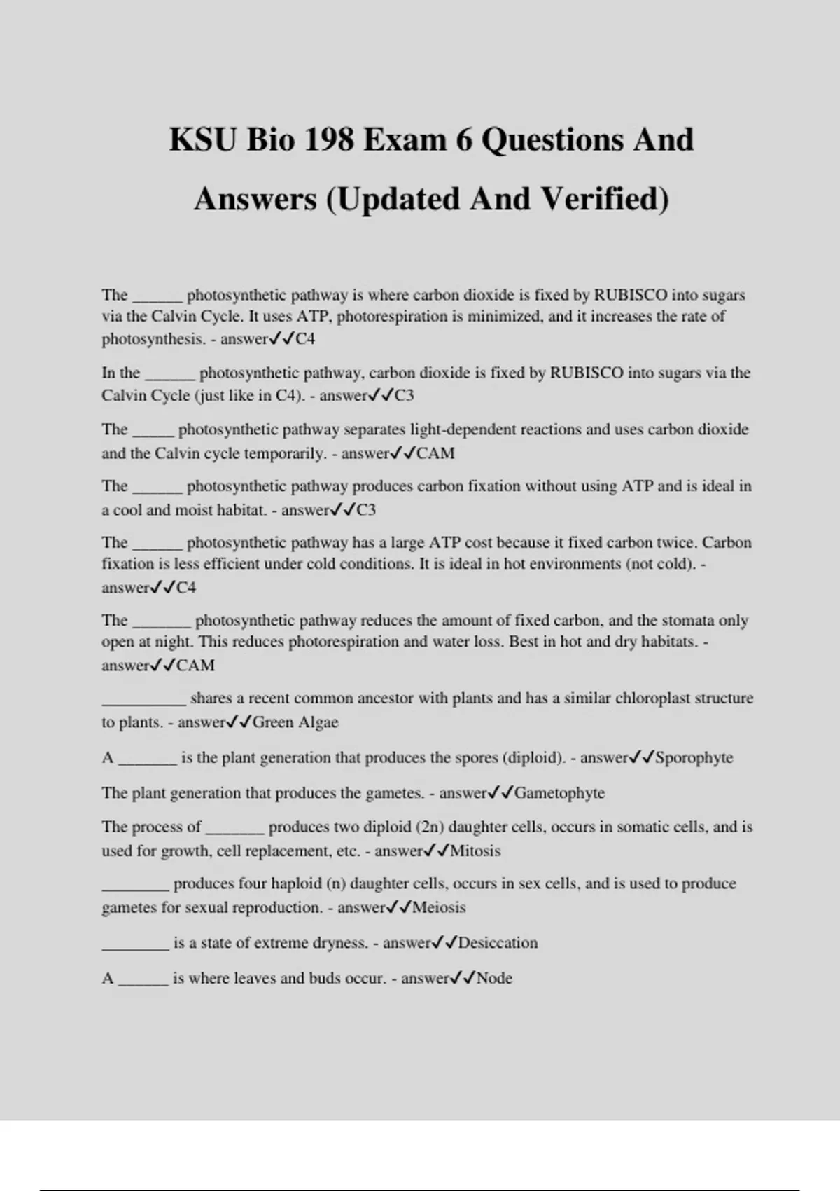 KSU Bio 198 Exam 6 Questions And Answers (Updated And Verified) The ______ photosynthetic pathway is where carbon dioxide is fixed by RUBISCO into sugars via the Calvin Cycle. It uses ATP, photorespiration is minimized, and it increases the rate of photosynthesis. - answerC4 In the ______ photosynthetic pathway, carbon dioxide is fixed by RUBISCO into sugars via the Calvin Cycle (just like in C4). - answerC3 The _____ photosynthetic pathway separates light-dependent reactions and uses carbon dioxide and the Calvin cycle temporarily. - answerCAM The ______ photosynthetic pathway produces carbon fixation without using ATP and is ideal in a cool and moist habitat. - answerC3 The ______ photosynthetic pathway has a large ATP cost because it fixed carbon twice. Carbon fixation is less efficient under cold conditions. It is ideal in hot environments (not cold). - answerC4 The _______ photosynthetic pathway reduces the amount of fixed carbon, and the stomata only open at night. This reduces photorespiration and water loss. Best in hot and dry habitats. - answerCAM __________ shares a recent common ancestor with plants and has a similar chloroplast structure to plants. - answerGreen Algae A _______ is the plant generation that produces the spores (diploid). - answerSporophyte The plant generation that produces the gametes. - answerGametophyte The process of _______ produces two diploid (2n) daughter cells, occurs in somatic cells, and is used for growth, cell replacement, etc. - answerMitosis ________ produces four haploid (n) daughter cells, occurs in sex cells, and is used to produce gametes for sexual reproduction. - answerMeiosis ________ is a state of extreme dryness. - answerDesiccation A ______ is where leaves and buds occur. - answerNode _______ are the spaces between nodes. - answerInternodes ______ is the zone of actively dividing cells. - answerMeristem _______ tissue covers and protects surfaces. - answerDermal Xylem and phloem are two examples of ____________. - answerVascular Tissue _____ tissue provides storage and structural support for vascular tissue - answerGround ________ is the meiosis-produced pollen (male gametophyte). - answerStamen ______ is the meiosis-produced ovule (female gametophye). - answerPistle The process of _______ maintains ploidy levels. - answerMitosis The process of _________ reduces ploidy level. - answerMeiosis The fusion of _________ increases the ploidy level. - answergametes A _______ is a mature ovary specialized for the dispersal of seeds. - answerFruit _________ is the transfer of pollen to the stigma. - answerPollination _________ is the union of two gametes. - answerFertilization ________ is the uptake of water by a germinating seed. - answerImbibition __________ is the resumption of growth after seed dormancy is broken. - answerGermination The apical meristem is the ________ growth. - answerprimary The lateral meristem is __________ growth. - answersecondary ________ is a plant hormone that stimulates cell division and causes shoot elongation. - answerGibberellin ________ is dead at maturity and transports water and nutrients from roots to shoots. - answerXylem ________ is alive at maturity and transports photosynthates (sugars) & organic compounds. - answerPhloem ___________ is the loss of water from a leaf due to evaporation. - answerTranspiration ________ molecules are small, polar, cohesive, and adhesive. - answerWater Crossing a membrane from high to low concentration without expending energy is called ______ transport. - answerpassive