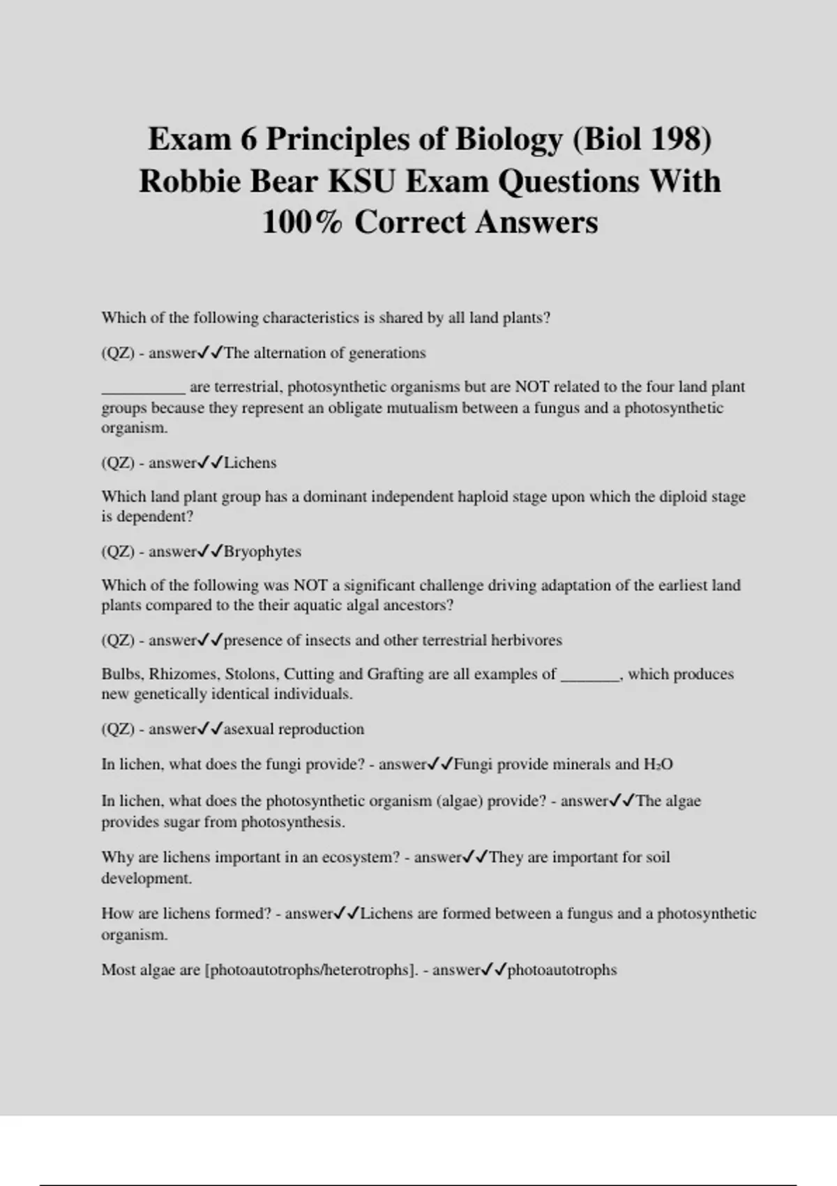 Exam 6 Principles of Biology (Biol 198) Robbie Bear KSU Exam Questions With 100% Correct Answers Which of the following characteristics is shared by all land plants? (QZ) - answerThe alternation of generations __________ are terrestrial, photosynthetic organisms but are NOT related to the four land plant groups because they represent an obligate mutualism between a fungus and a photosynthetic organism. (QZ) - answerLichens Which land plant group has a dominant independent haploid stage upon which the diploid stage is dependent? (QZ) - answerBryophytes Which of the following was NOT a significant challenge driving adaptation of the earliest land plants compared to the their aquatic algal ancestors? (QZ) - answerpresence of insects and other terrestrial herbivores Bulbs, Rhizomes, Stolons, Cutting and Grafting are all examples of _______, which produces new genetically identical individuals. (QZ) - answerasexual reproduction In lichen, what does the fungi provide? - answerFungi provide minerals and H₂O In lichen, what does the photosynthetic organism (algae) provide? - answerThe algae provides sugar from photosynthesis. Why are lichens important in an ecosystem? - answerThey are important for soil development. How are lichens formed? - answerLichens are formed between a fungus and a photosynthetic organism. Most algae are [photoautotrophs/heterotrophs]. - answerphotoautotrophs All algae are eukaryotes belonging to the Kingdom ______. - answerProtista Where do most species of red and green algae live? - answerIn the water Why are algae important to humans? - answerThey produce lots of oxygen. Know the life cycle for Chara (type of green algae). - answerOn page 329 of studio manual and chapter 21 in the textbook. Plants and green algae are thought to have evolved from a common ancestor. What biochemical and structural evidence supports this hypothesis? - answerBoth have cell walls that are made of cellulose. They both have chloroplasts that contain chlorophyll a and b. What are 2 similar traits between the life cycle of Chara and plants? - answer1. They both produce spores. 2. Both have haploid and diploid stages. What are the main challenges that plants needed to overcome in order to live on land? - answerResist drying Resist gravity Dry fertilization (pollen, how to move gametes without water) Protect offspring on dry land (seeds) What were 3 features of terrestrial environment that made it advantageous for plants to invade land? - answer1. Abundant sunlight 2. CO₂ is more readily available and diffuses faster in air. 3. At first, no predators on land. What are the 4 adaptations that have evolved in plants that have allowed them to succeed in a terrestrial environment? - answer1. Alternation of generations 2. Sporangium where spores are formed 3. Gametangium that produces haploid cells 4. Apical merristem tissue in roots and shoots Memorize the life cycle of bryophytes. - answerOn page 331 of lab manual and chapter 21 of the textbook. The first group of plants to evolve to live on land. - answerBryophytes The first group of plants to evolve to live on land are the Bryophytes. When did this occur? - answerAbout 450 million years ago. Is the main dispersal stage (the spore) of Bryophytes haploid or diploid? - answerHaploid What is the dominant stage in Bryophytes? I