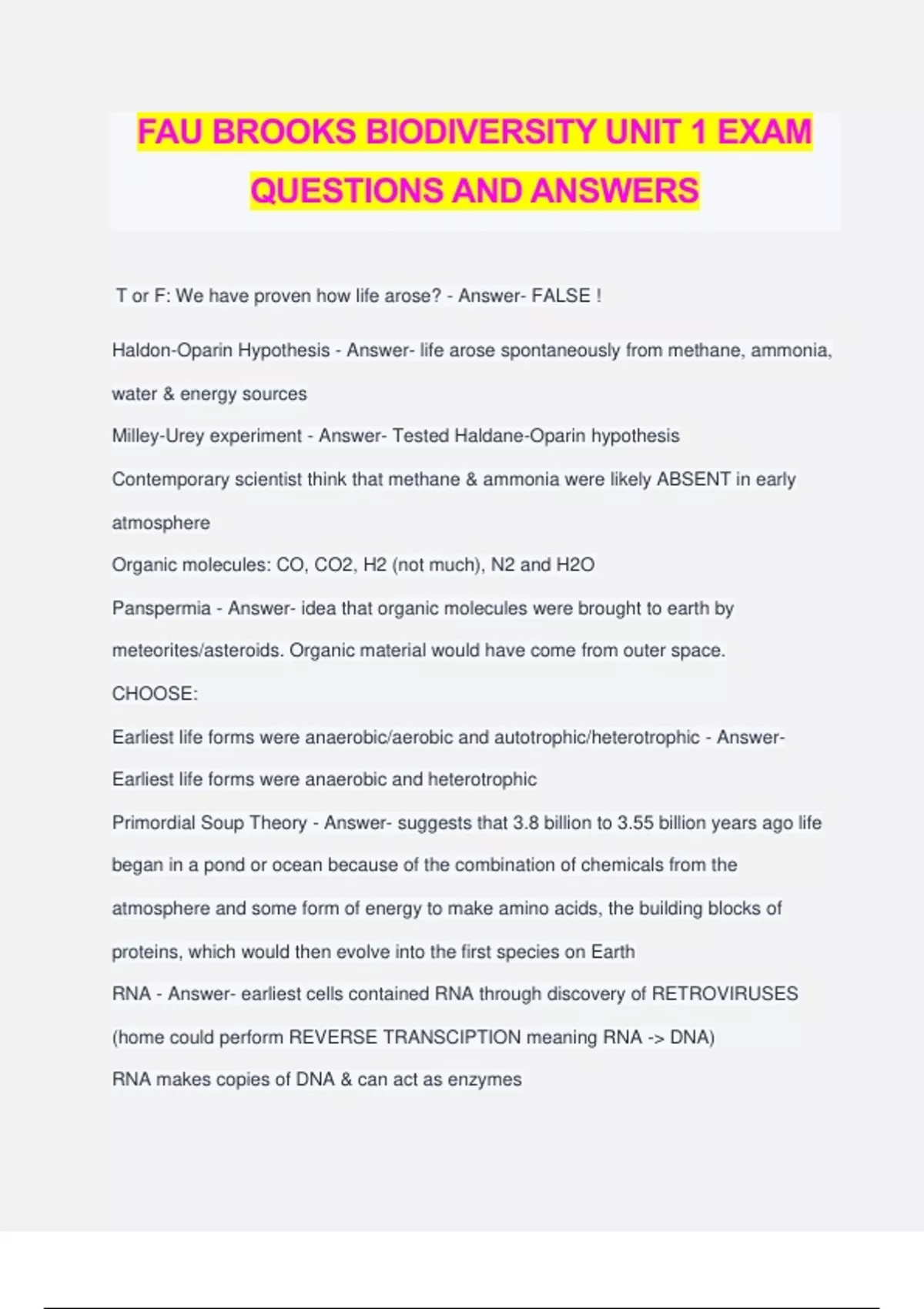 FAU BROOKS BIODIVERSITY UNIT 1 EXAM QUESTIONS AND ANSWERS T or F: We have proven how life arose? - Answer- FALSE ! Haldon-Oparin Hypothesis - Answer- life arose spontaneously from methane, ammonia, water & energy sources Milley-Urey experiment - Answer- Tested Haldane-Oparin hypothesis Contemporary scientist think that methane & ammonia were likely ABSENT in early atmosphere Organic molecules: CO, CO2, H2 (not much), N2 and H2O Panspermia - Answer- idea that organic molecules were brought to earth by meteorites/asteroids. Organic material would have come from outer space. CHOOSE: Earliest life forms were anaerobic/aerobic and autotrophic/heterotrophic - Answer- Earliest life forms were anaerobic and heterotrophic Primordial Soup Theory - Answer- suggests that 3.8 billion to 3.55 billion years ago life began in a pond or ocean because of the combination of chemicals from the atmosphere and some form of energy to make amino acids, the building blocks of proteins, which would then evolve into the first species on Earth RNA - Answer- earliest cells contained RNA through discovery of RETROVIRUSES (home could perform REVERSE TRANSCIPTION meaning RNA - DNA) RNA makes copies of DNA & can act as enzymes Unresolved problems regarding how life came about - Answer- The concept of large, complex, organic molecules via dehydration of condensation bonds in an aquatic environment is questionable because the presence of water favors hydrolysis (break down) or large molecules rather than assembly of small molecules to large ones. ALSO The concept of "self-replicating" systems, meaning asexual reproduction AKA how the first organism could have reproduced is also questionable because little evidence that abiotic systems can spontaneously reproduce exists. THE EARLIEST CELLS - Answer- THE EARLIEST CELLS (this is just a divider y'all don't trip) T or F: Heterotrophic anaerobes were the "first" living cells? - Answer- TRUE ! Types of Anaerobes - Answer- Obligate Anaerobes: exposure to oxygen resulted in death; probably what anaerobes initially were