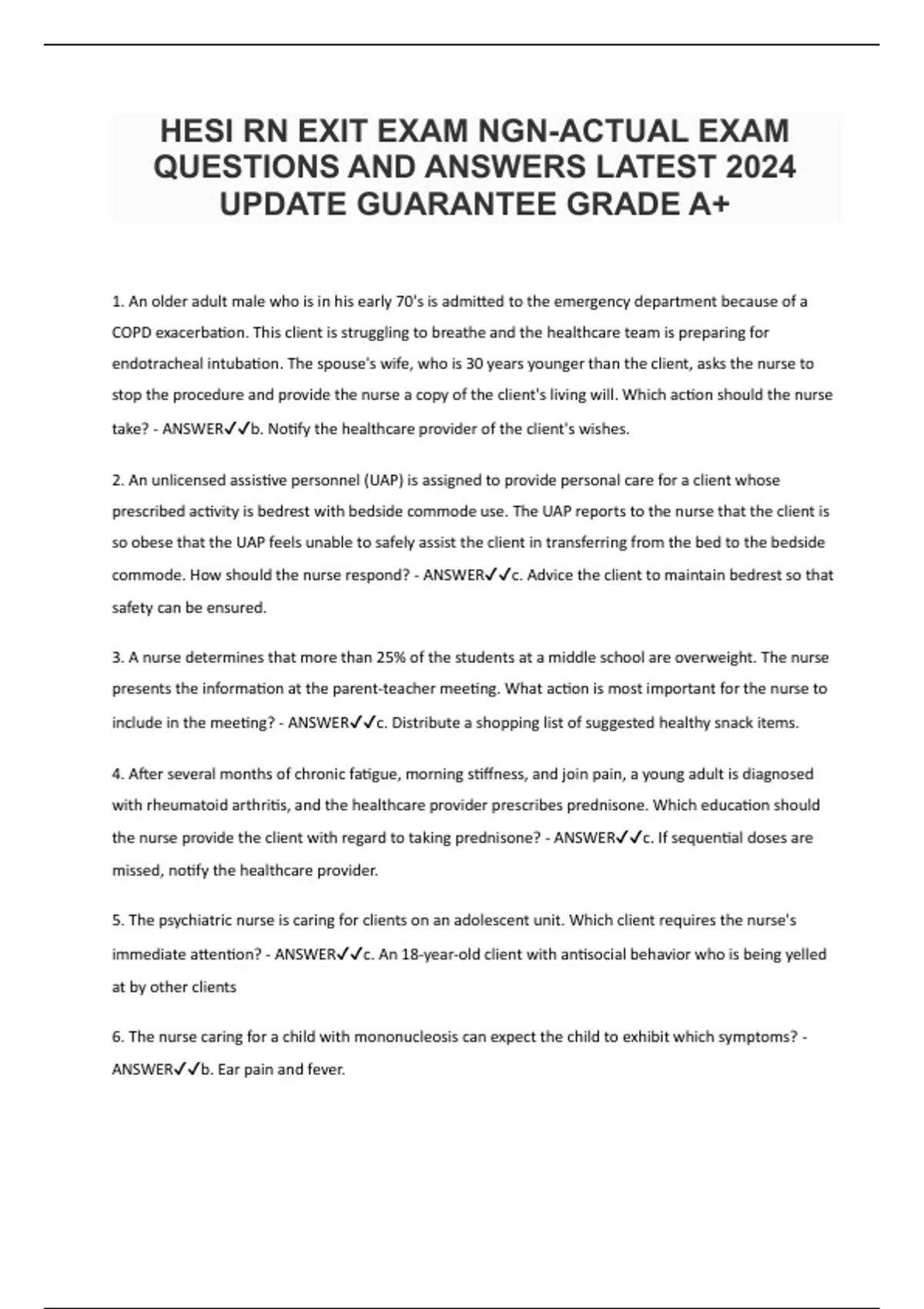 HESI RN EXIT EXAM NGN-ACTUAL EXAM QUESTIONS AND ANSWERS LATEST 2024 UPDATE GUARANTEE GRADE A+