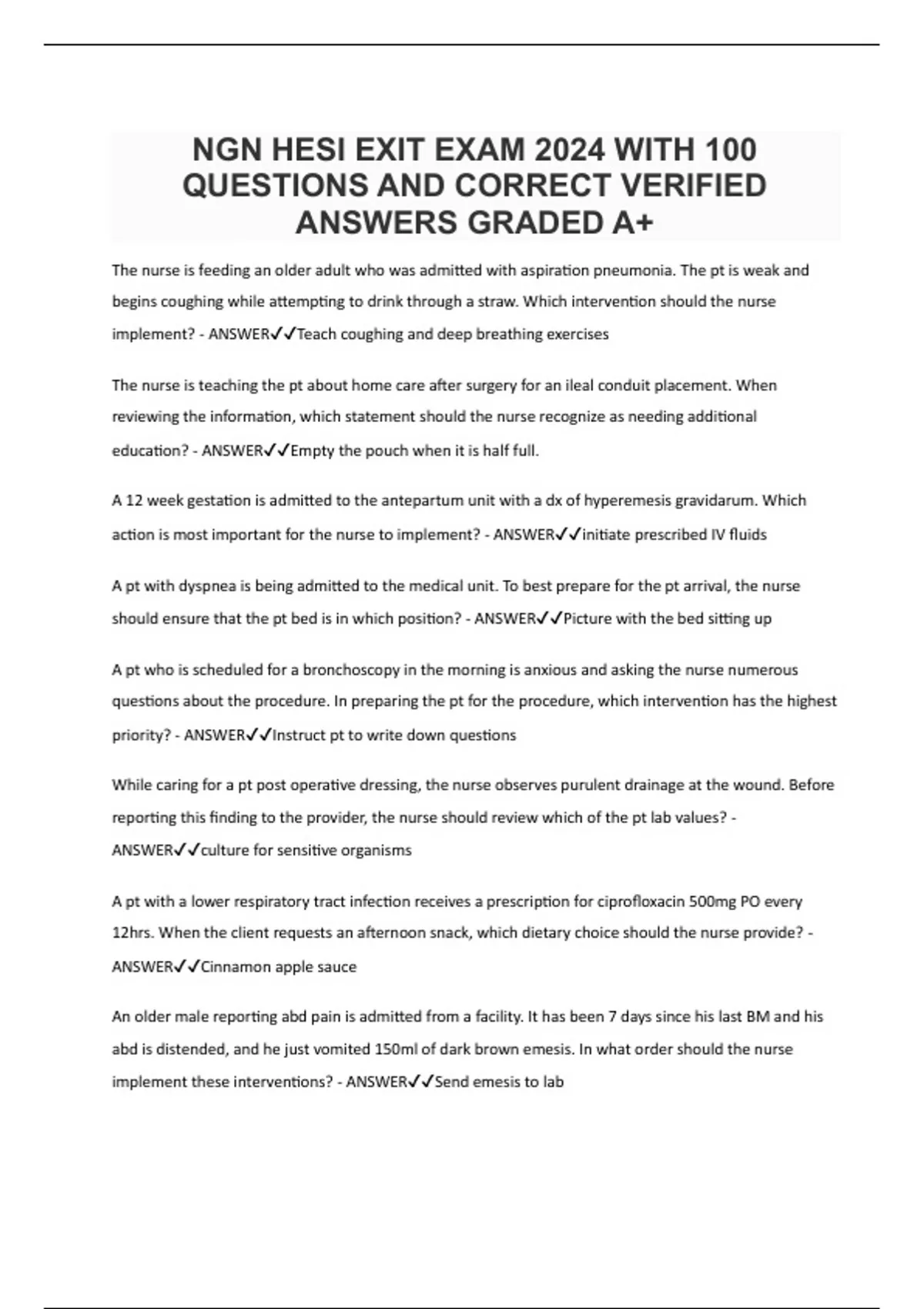 NGN HESI EXIT EXAM 2024 WITH 100 QUESTIONS AND CORRECT VERIFIED ANSWERS GRADED A+.