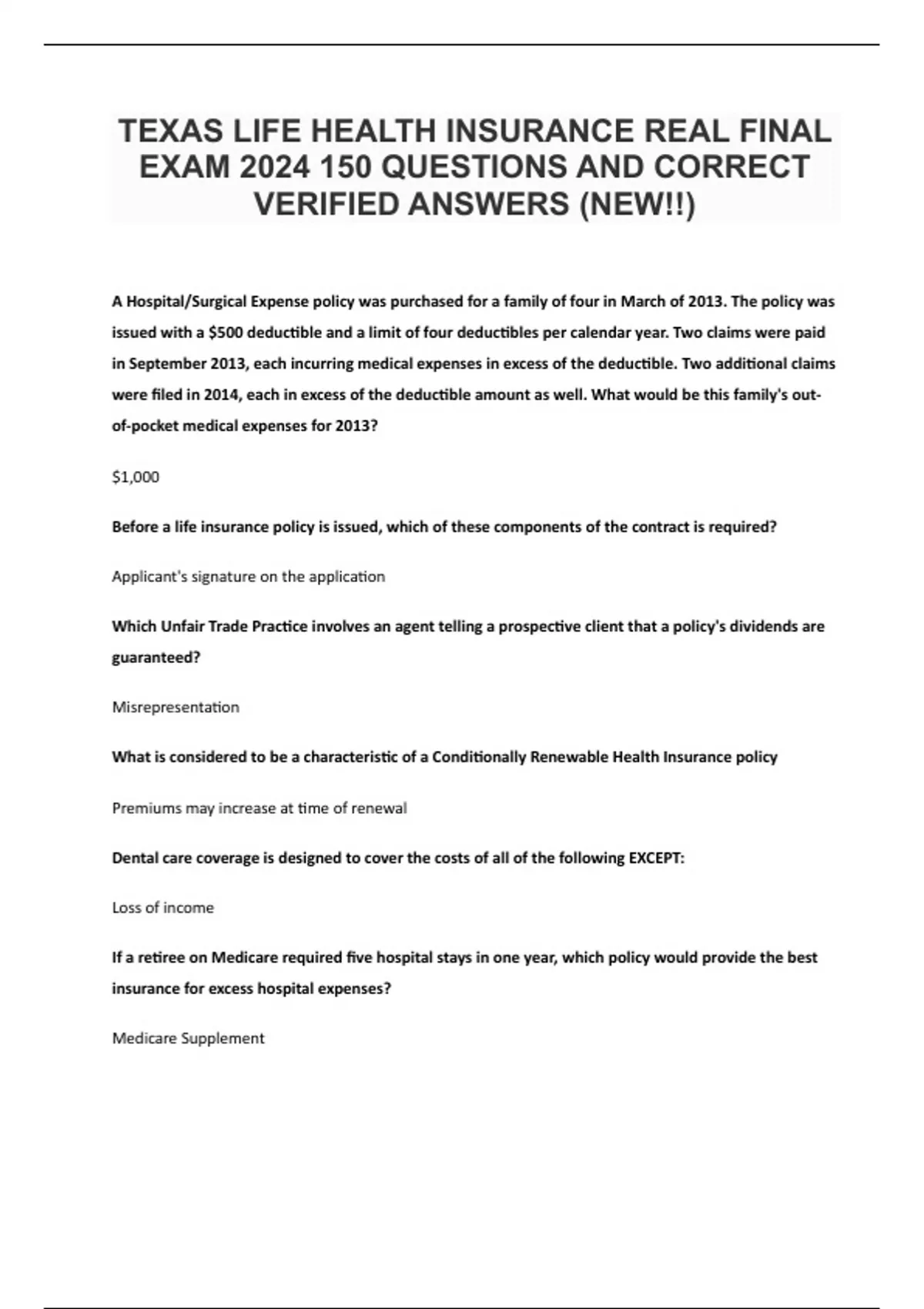 TEXAS LIFE HEALTH INSURANCE REAL FINAL EXAM 2024 150 QUESTIONS AND CORRECT VERIFIED ANSWERS (NEW!!)
