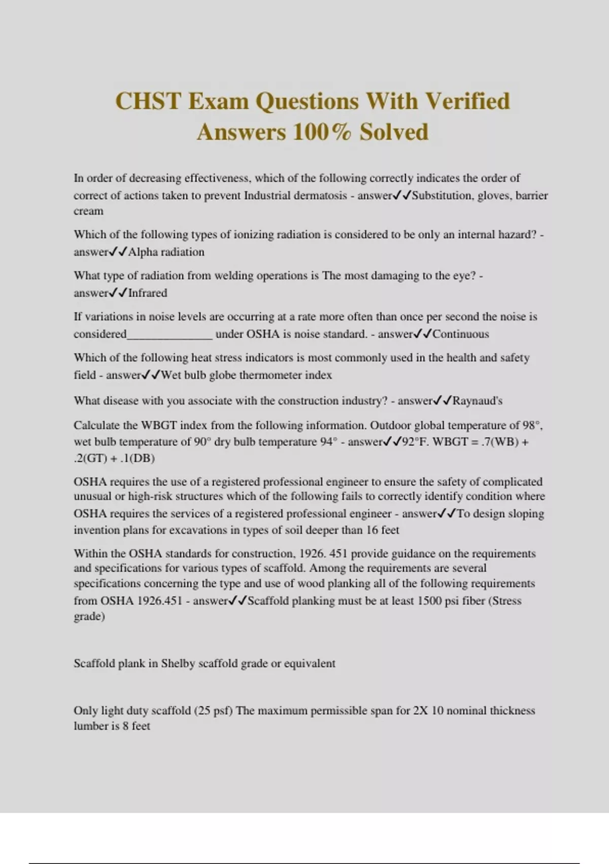 CHST Exam Questions With Verified Answers 100% Solved In order of decreasing effectiveness, which of the following correctly indicates the order of correct of actions taken to prevent Industrial dermatosis - answerSubstitution, gloves, barrier cream Which of the following types of ionizing radiation is considered to be only an internal hazard? - answerAlpha radiation What type of radiation from welding operations is The most damaging to the eye? - answerInfrared If variations in noise levels are occurring at a rate more often than once per second the noise is considered______________ under OSHA is noise standard. - answerContinuous Which of the following heat stress indicators is most commonly used in the health and safety field - answerWet bulb globe thermometer index What disease with you associate with the construction industry? - answerRaynaud's Calculate the WBGT index from the following information. Outdoor global temperature of 98°, wet bulb temperature of 90° dry bulb temperature 94° - answer92°F. WBGT = .7(WB) + .2(GT) + .1(DB) OSHA requires the use of a registered professional engineer to ensure the safety of complicated unusual or high-risk structures which of the following fails to correctly identify condition where OSHA requires the services of a registered professional engineer - answerTo design sloping invention plans for excavations in types of soil deeper than 16 feet Within the OSHA standards for construction, 1926. 451 provide guidance on the requirements and specifications for various types of scaffold. Among the requirements are several specifications concerning the type and use of wood planking all of the following requirements from OSHA 1926.451 - answerScaffold planking must be at least 1500 psi fiber (Stress grade) Scaffold plank in Shelby scaffold grade or equivalent Only light duty scaffold (25 psf) The maximum permissible span for 2X 10 nominal thickness lumber is 8 feet The following description best fits the intent of the OSHA standards when referring to a competent person - answerThe person who is capable of identifying existing and predictable hazards in the surroundings or working conditions which are unsanitary, hazardous, or dangerous to employees, and who has authorization to take prompt correct of measures to eliminate them Rolling tower scalpels are popular with most of the trades for example painters, maintenance man, electricians, sign installers, heating in the leading man. The rolling tower is easy to move around in an area and provides a stable platform for which to work. Generally, the tower scaffold are equipped with five or 8 inch casters that have a break permitting the worker to lock the wheel. Additionally, The scaffold can be equipped without meters. OSHA requires out Riggers on any scaffold with a height to base ratio exceeding? - answer4 The OSHA regulation covering underground construction is 1926.800, which covers the construction of underground tunnels, shafts, chambers and cut-and-cover excavations. According to OSHA 1926.800 ventilation must be provided to maintain underground air quality. How many cubic feet of fresh air is required for each worker underground? - answer200 ft.³ The physiological property of matter that defines the capacity of a chemical to harm or injure a living organism by other than mechanical means is the definition of? - answerToxicity - The question accurately states the definition of toxicity Within the OSHA standards for construction, 1926.451 provides guidance on the requirements and specifications for various types of scaffold. According to the standard all the following are correct - answerScaffold erection is not permitted except under the direction of a competent person Guard rails and toe boards shall be installed on all open sides and ends of platforms more than 10 feet above the ground or floor, except needle beam scaffolds and floats All planking Used must be scaffold grade or equivalent Depending on the industry, frequent inspection of chains is required, the best way to inspect chains during these inspections is to: - answerPerform a detailed link by link inspection of entire chain Which of the following electrical devices would most likely contain polychlorinated biphenyl (PCBs) - answerTransformers, capacitors, fluorescent light ballast. - PCBs are found in certain electrical devices The OSHA regulation covering underground construction is 1926.800, which covers the construction of underground tunnels, shafts, chambers and cut-and-cover excavations. The regulation establishes a competent person as the responsible party for various inspection and oversight operations in the underground environment which of the following is not a specific